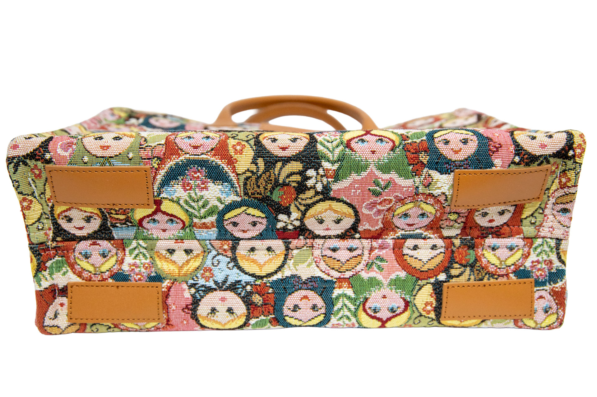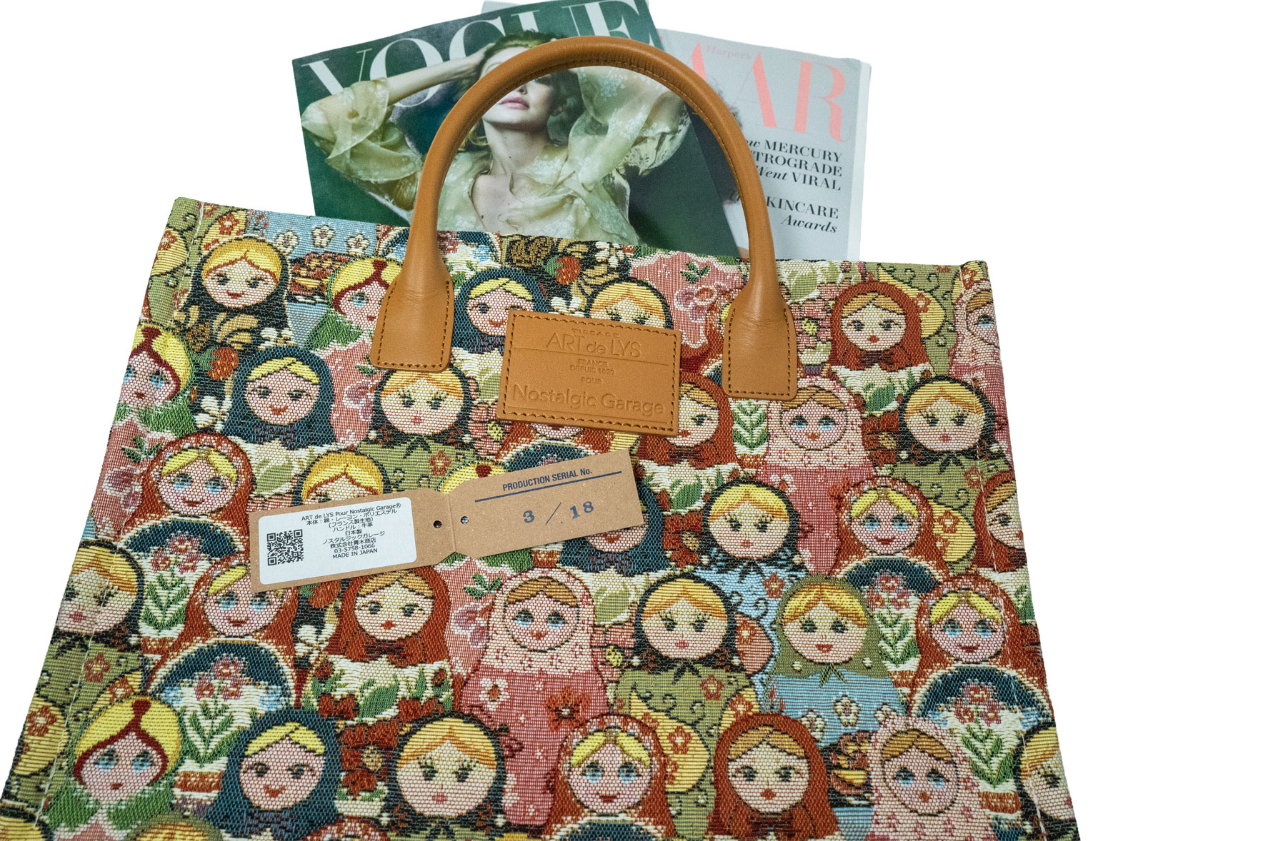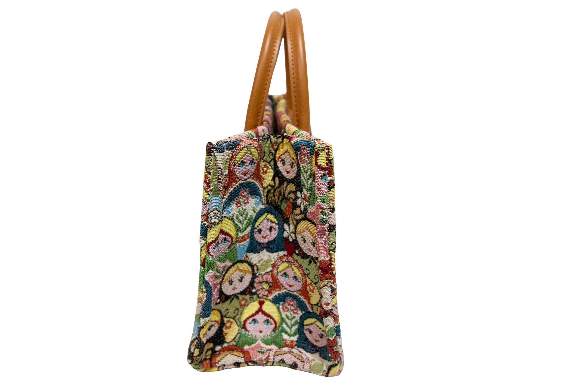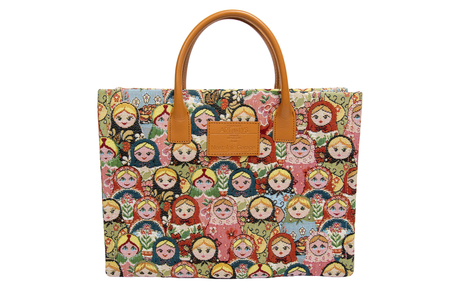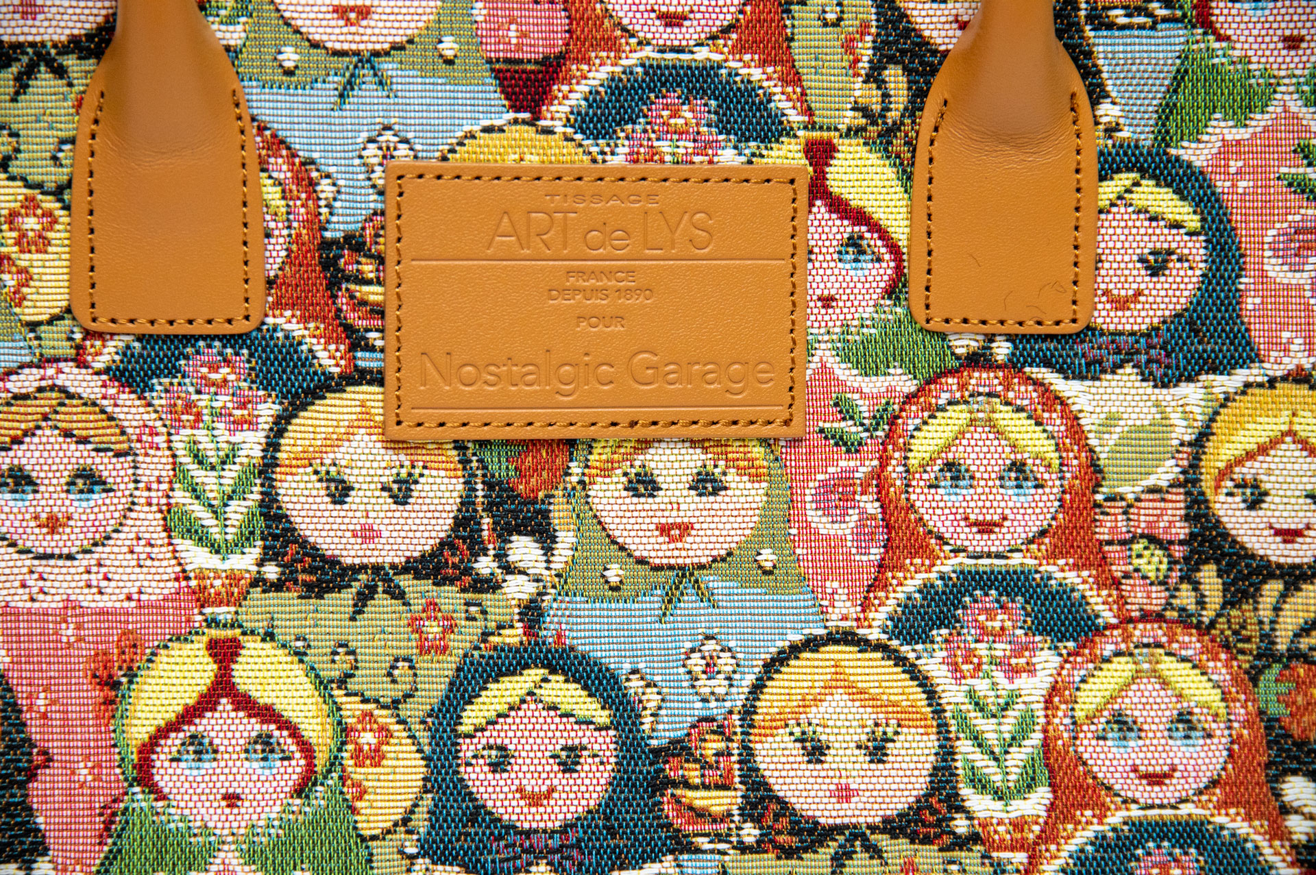 ずらりと並んだマトリョーシカたちは、一つひとつが異なる表情を持ち、まるで楽しげな会話が聞こえてくるよう。フランス製生地ならではの色彩感覚と、緻密なジャガード織りの技術が、マトリョーシカの衣装の細かな刺繍模様まで鮮やかに描き出しています。他では決して手に入らない、ブランドの想いが詰まった独占的なデザインです。