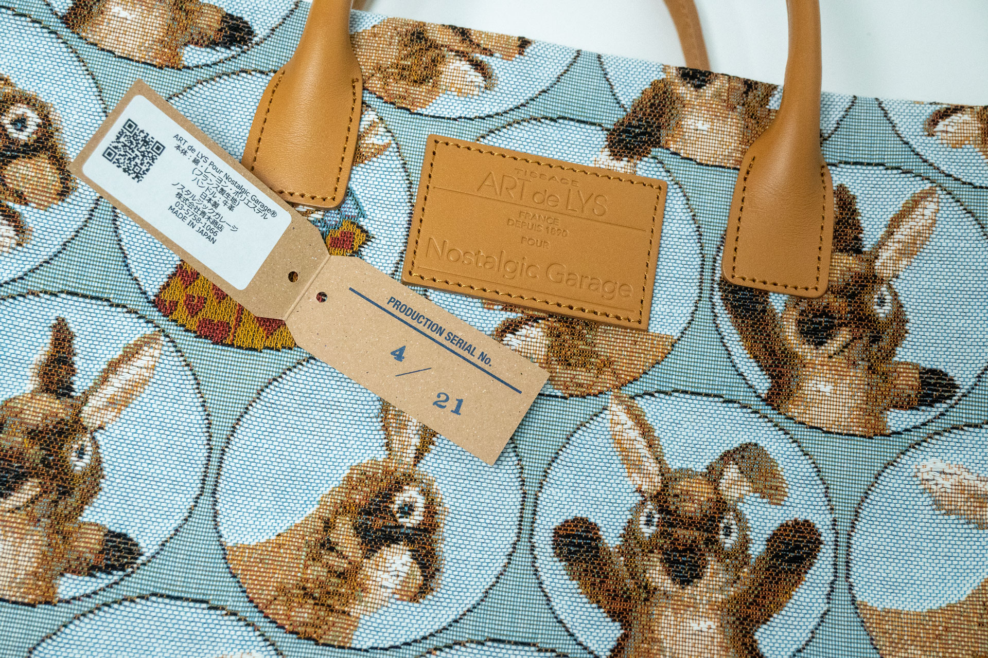 内装に隠された「にんじん」の秘密: バッグを開けると広がる、心躍るにんじん柄。実はこの裏生地も、ノスタルジックガレージがこのシリーズのために製作した完全オリジナルテキスタイルです。表のうさぎたちが今にも飛び込んできそうなユーモア溢れる演出は、使う人だけが知っている贅沢な仕掛けです。