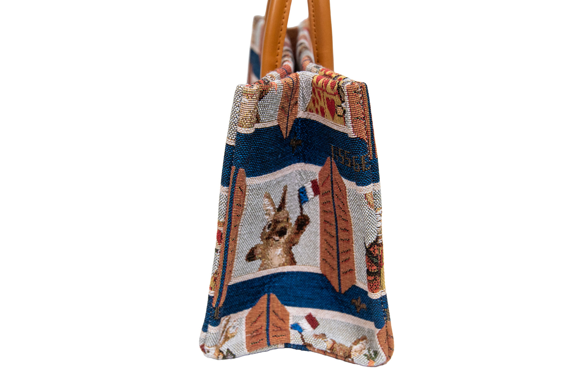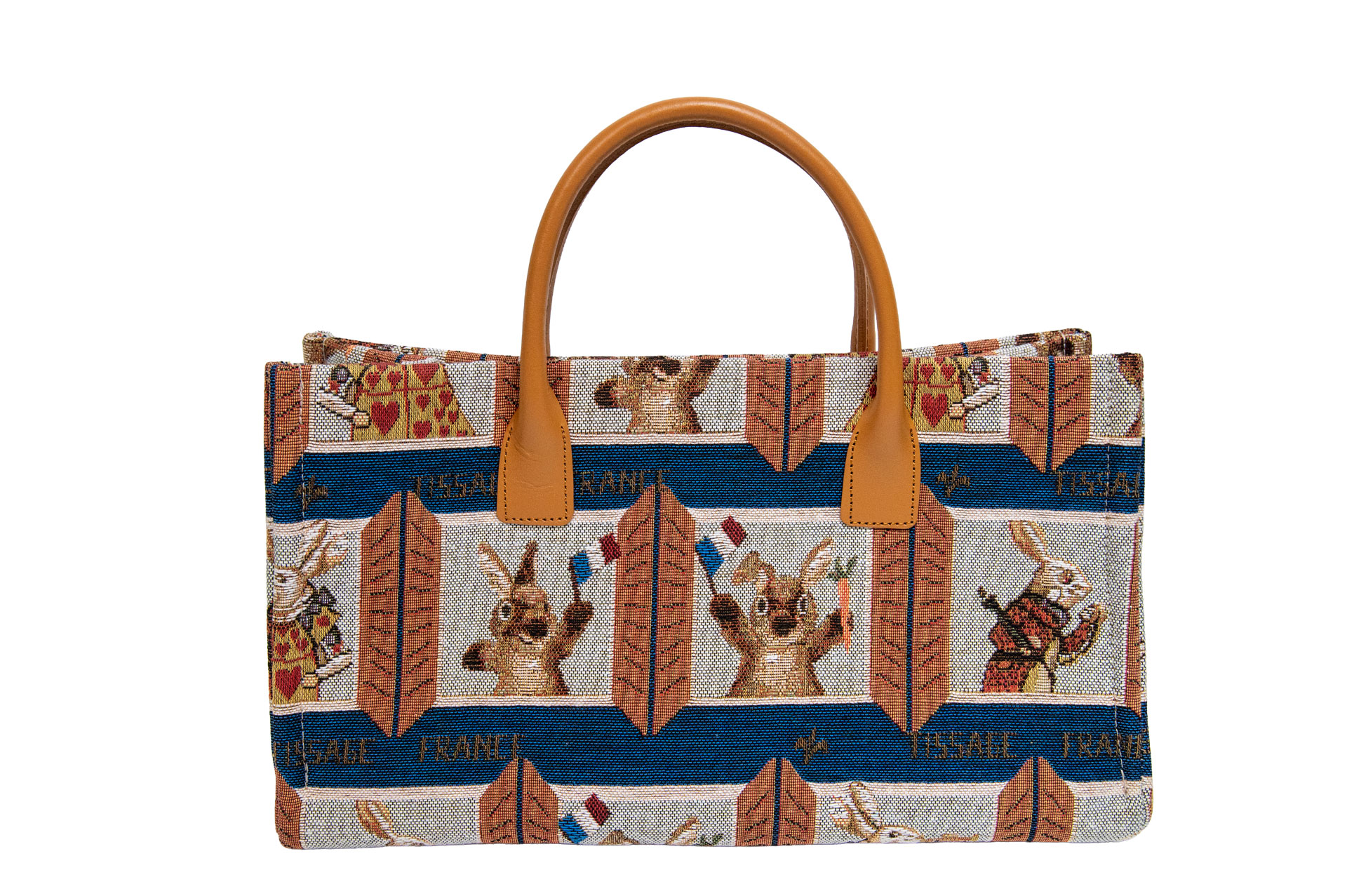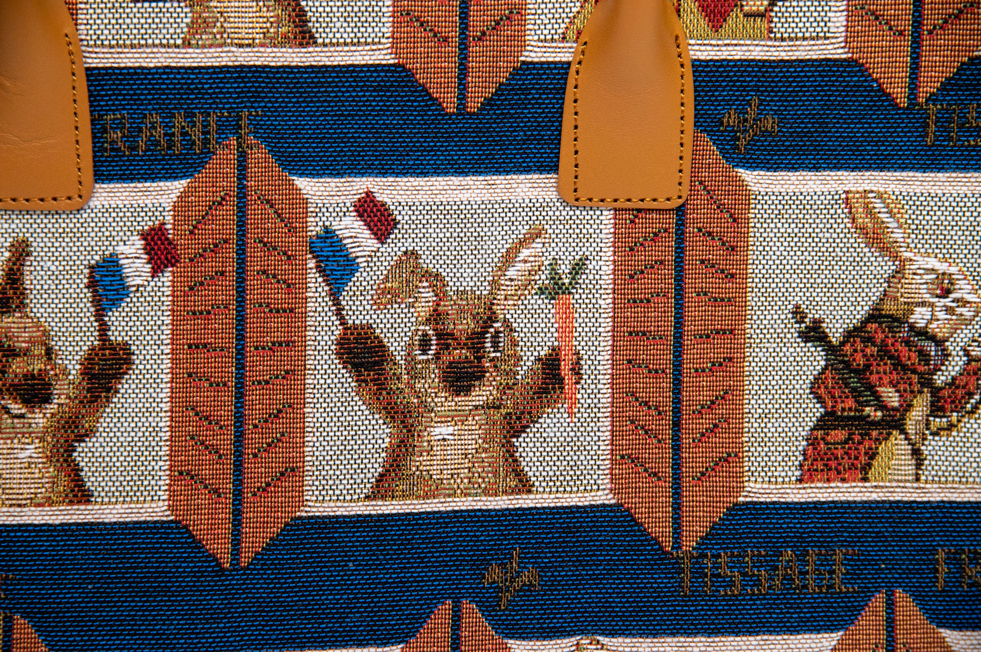 名門が紡ぐ、最高級のゴブラン織り: 綿・レーヨン・ポリエステルの混紡生地は、シルクのような光沢と重厚な質感を併せ持ちます。ミケーレのシルエットやアリスのうさぎの細かな表情、そして背景のフラッグ模様まで、名門の機(はた)ならではの緻密な織りで表現されています。