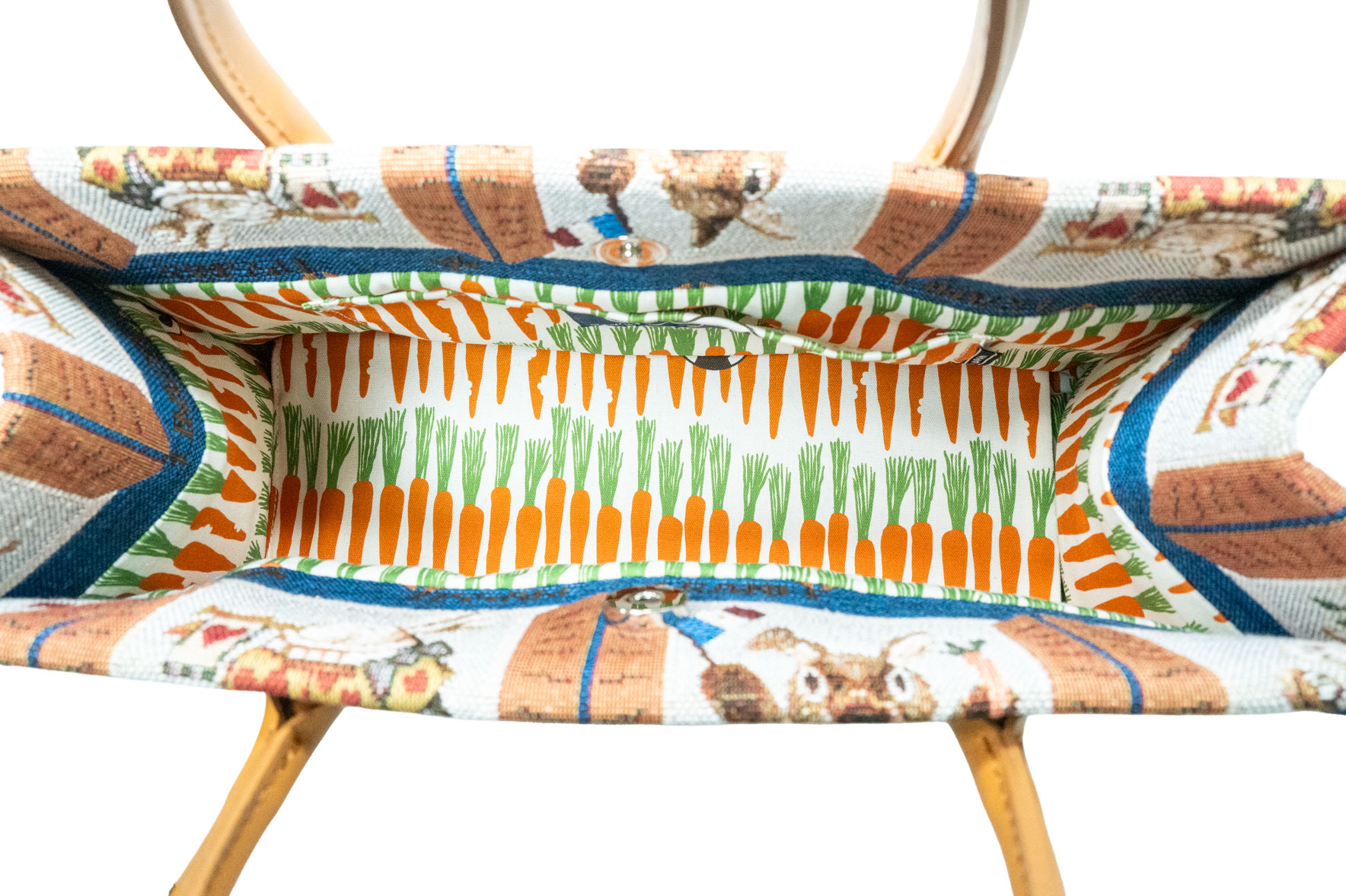 内装に広がる、オリジナルのにんじん柄: バッグを開けると、鮮やかな「にんじん模様」が目に飛び込みます。実はこの裏生地も、当ブランドがこのシリーズのために製作した完全オリジナルのテキスタイル。表地のうさぎたちとリンクしたユーモア溢れる仕掛けは、使うたびに心躍る体験を届けてくれます。