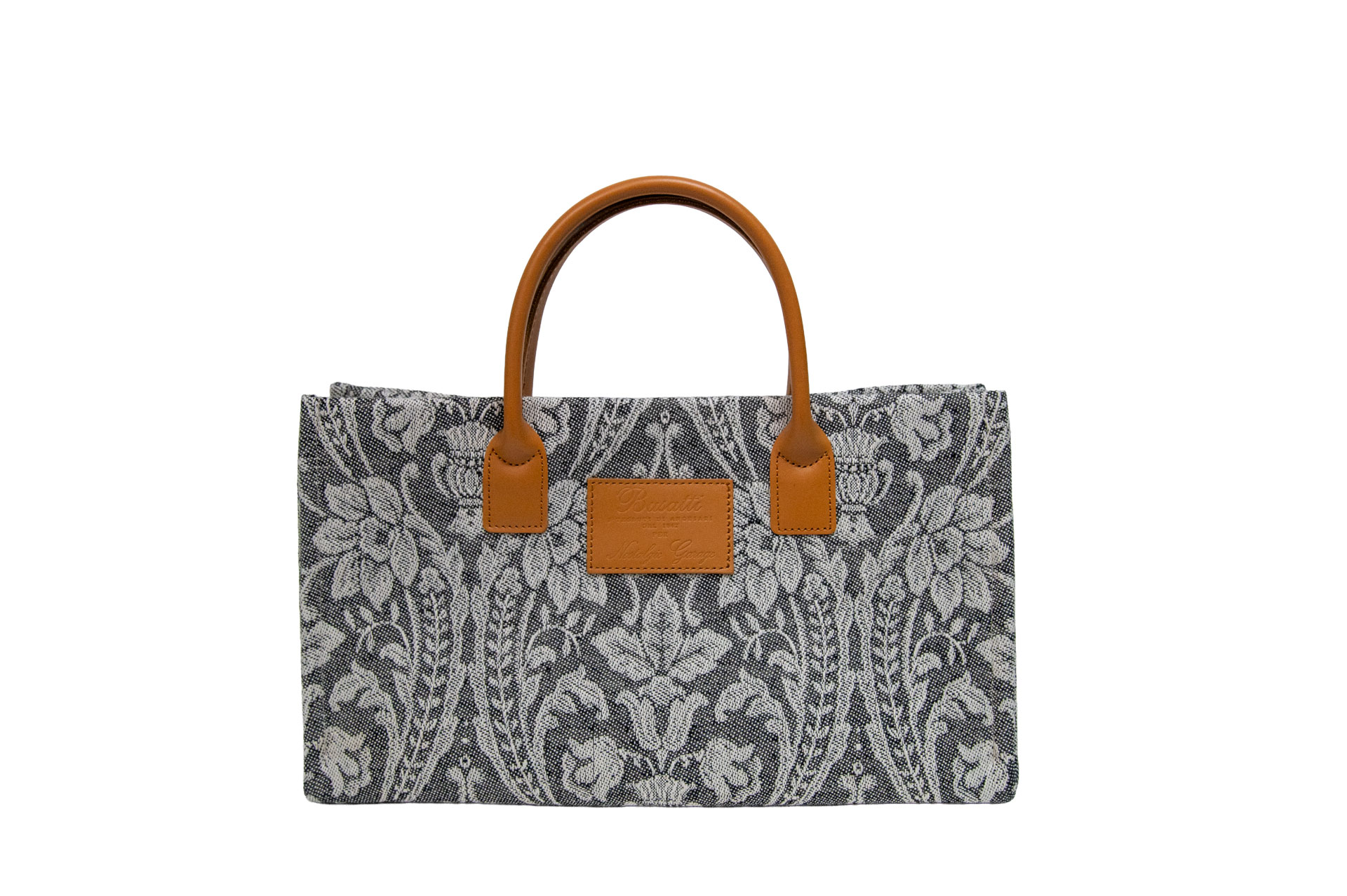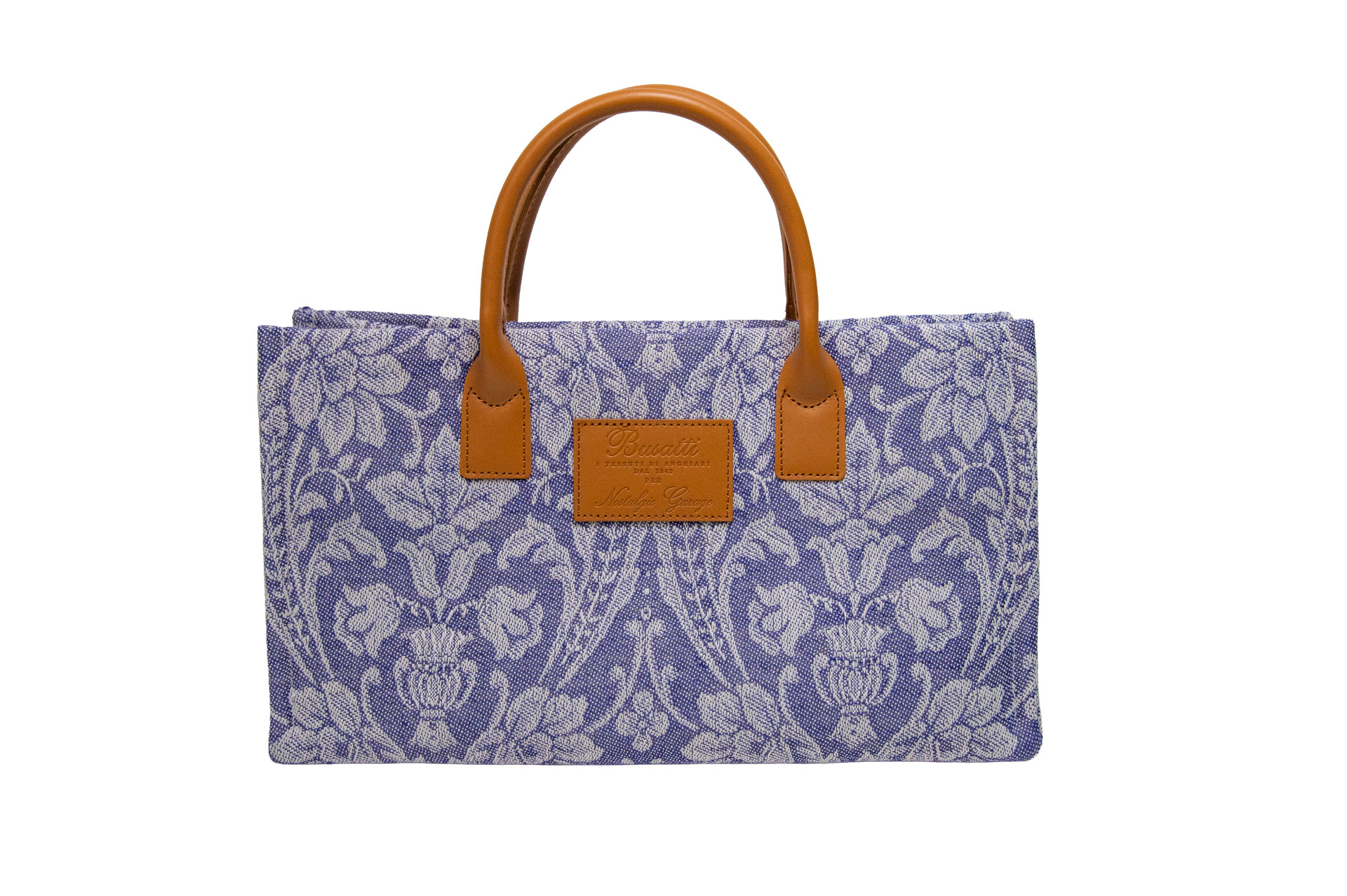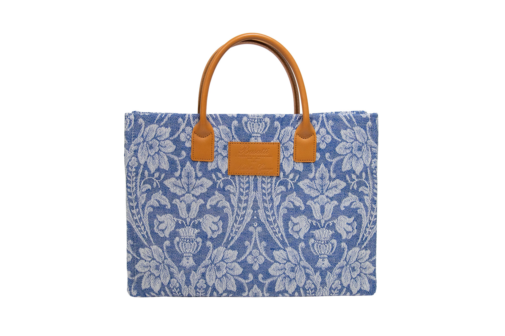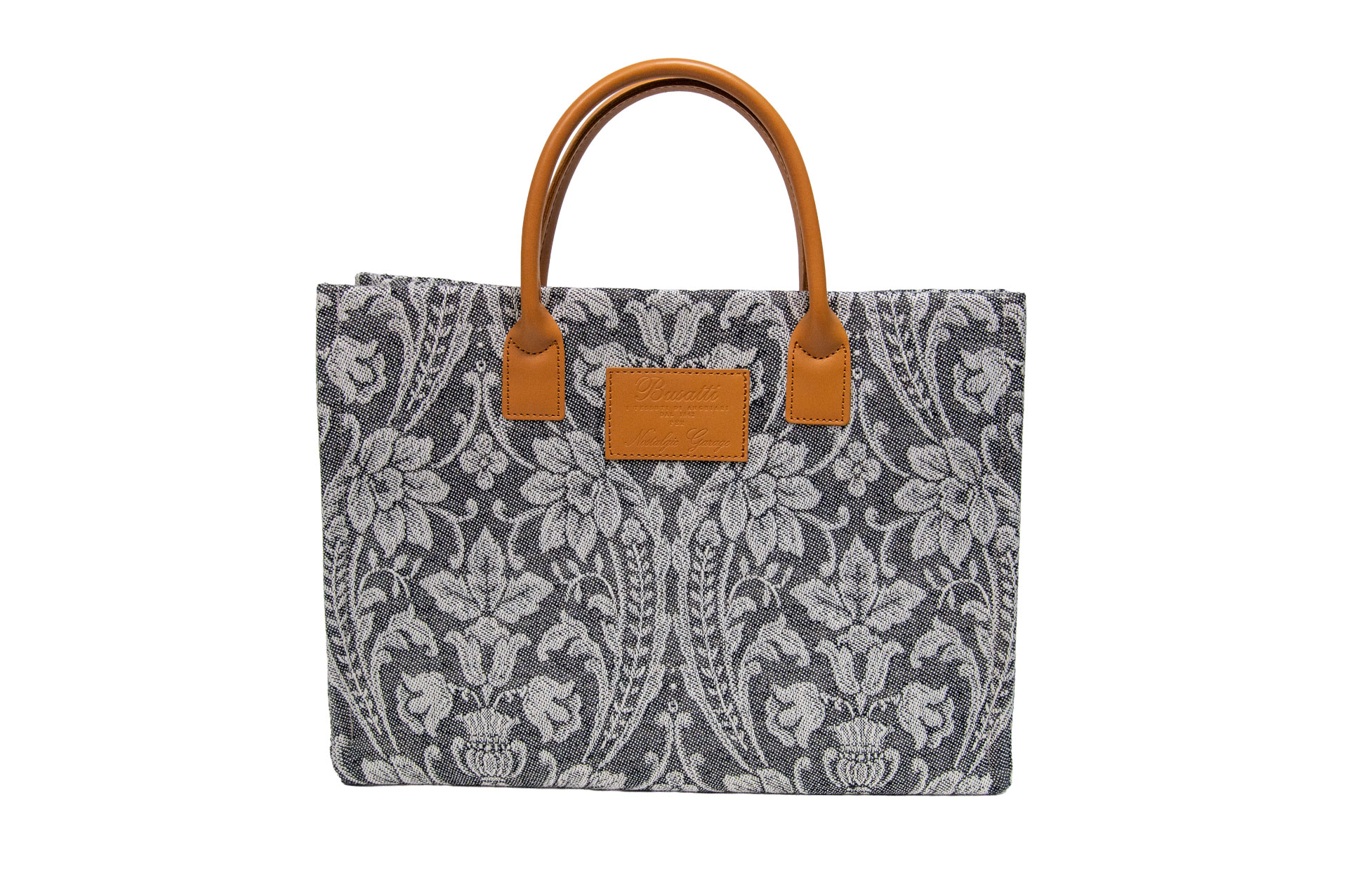 伝統を象徴するレザーパッチ: フロントにはBussatti社のロゴを刻印したレザーパッチを配置。キャメルカラーの本革ハンドルが、ジャガード織りの繊細な表情に温かみのあるクラス感をプラスします。