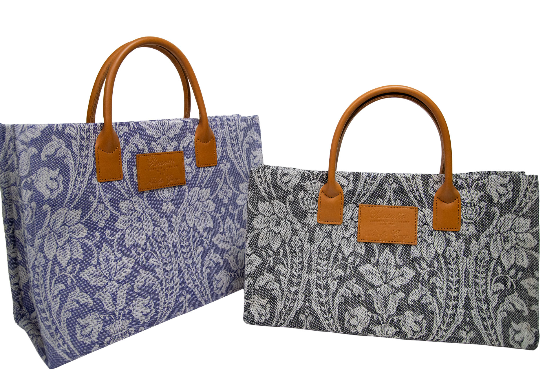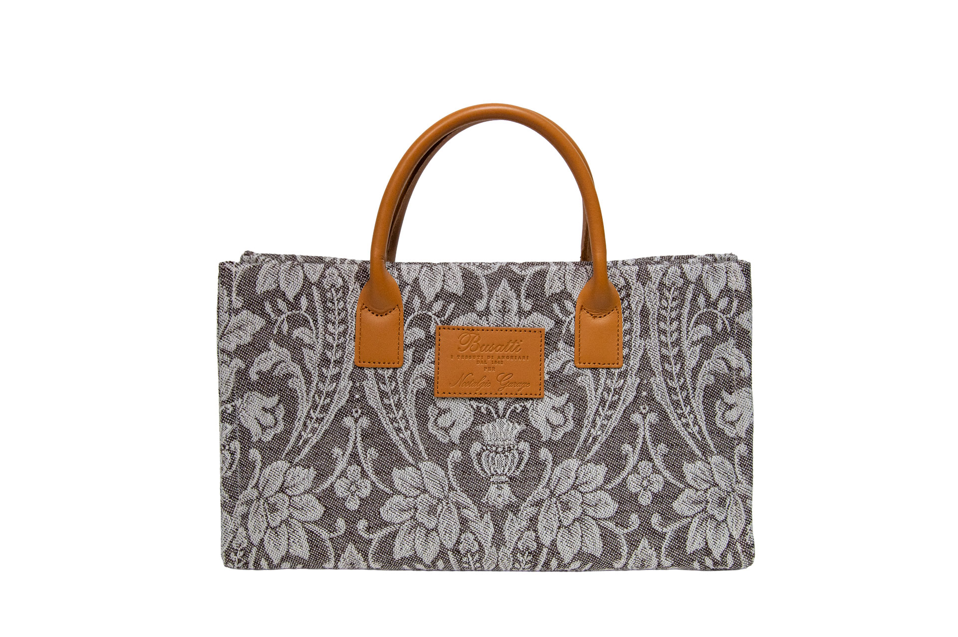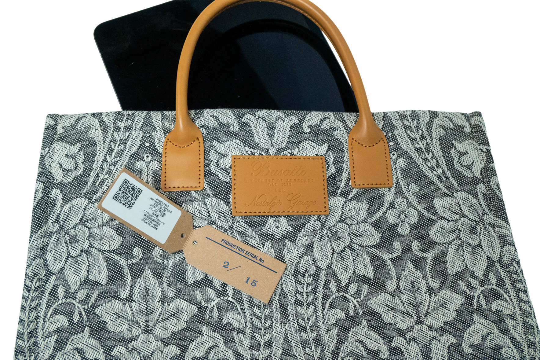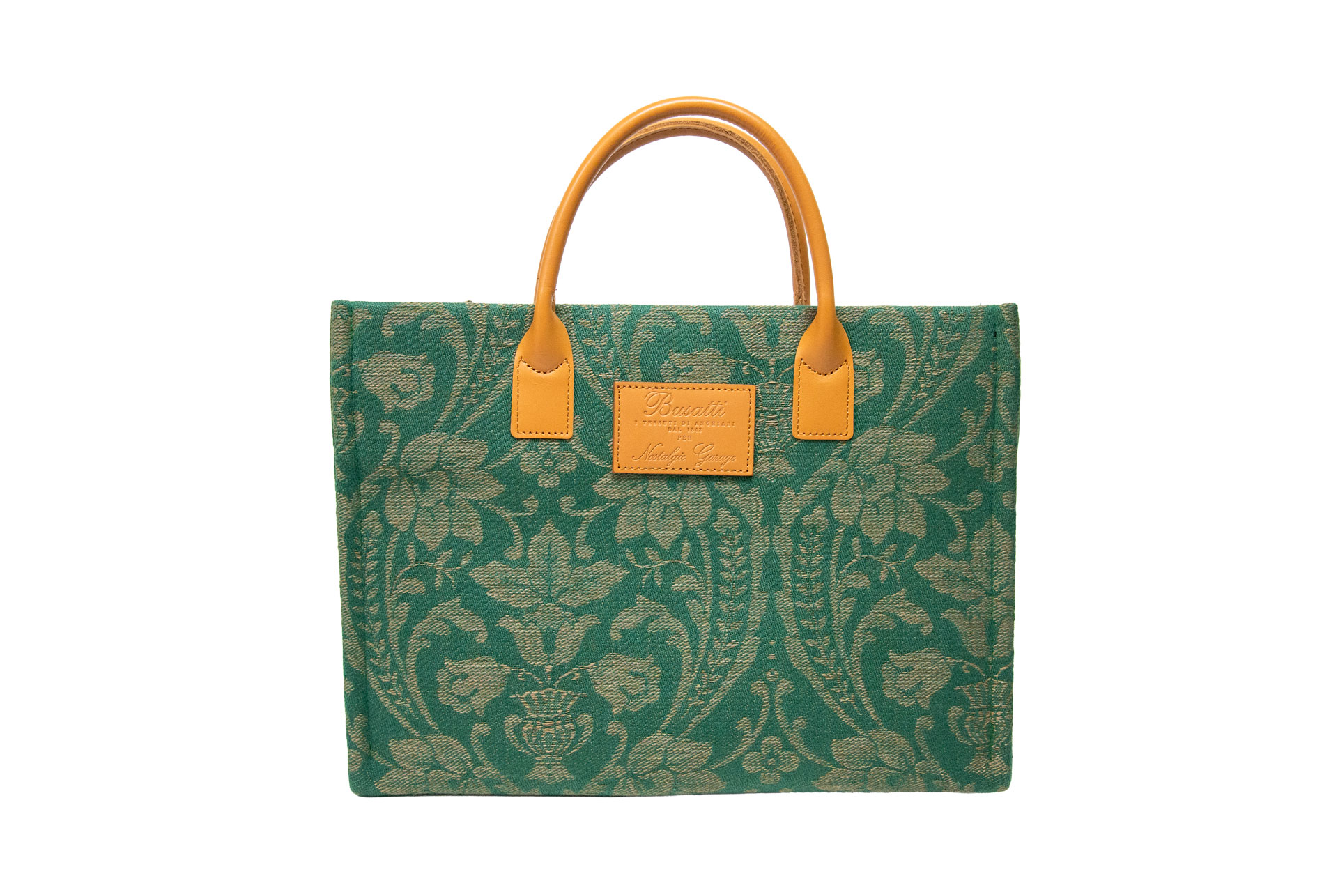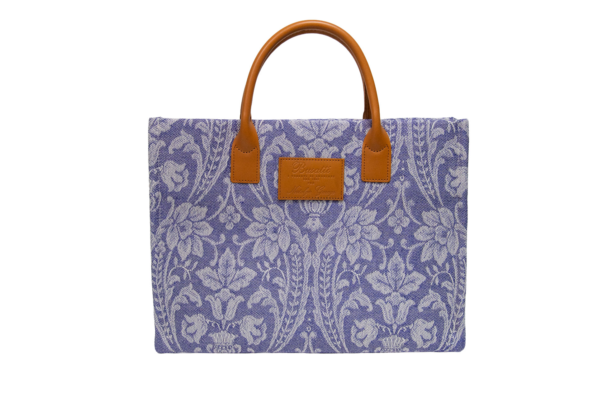 伝統を象徴するレザーパッチ: フロントにはBussatti社のロゴを刻印したレザーパッチを配置。キャメルカラーの本革ハンドルが、ジャガード織りの繊細な表情に温かみのあるクラス感をプラスします。