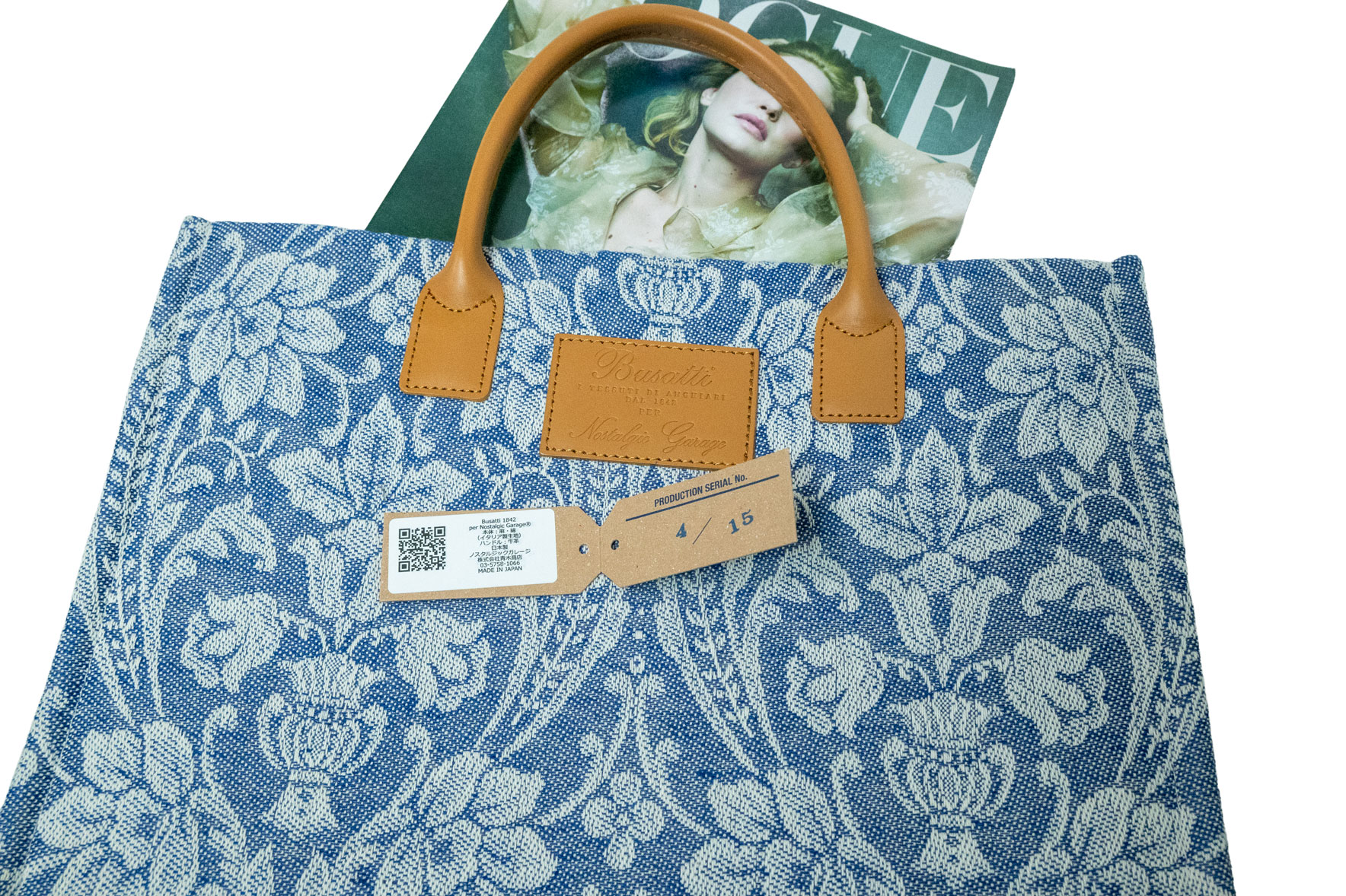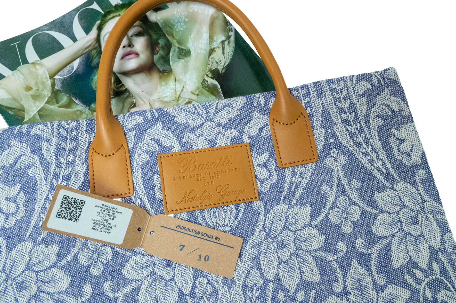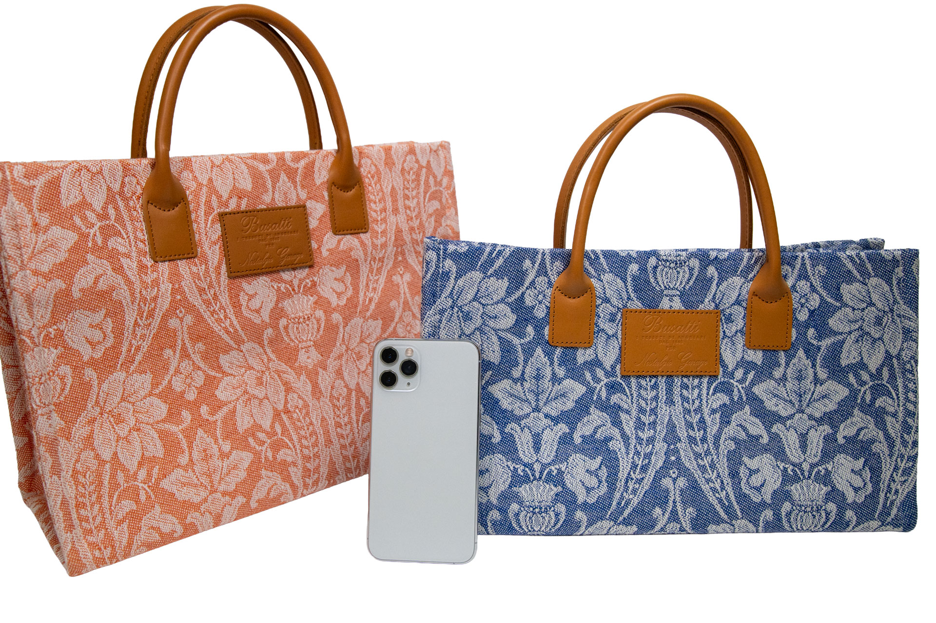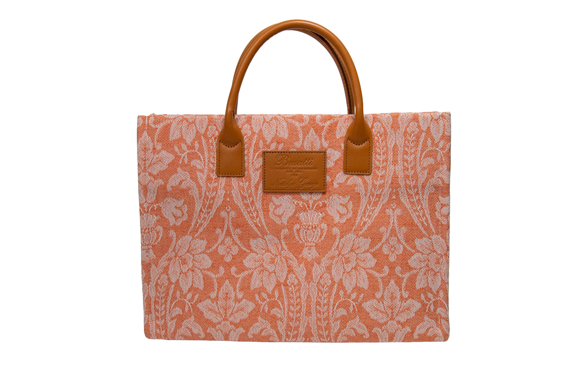 伝統を象徴するレザーパッチ: フロントにはBussatti社のロゴを刻印したレザーパッチを配置。キャメルカラーの本革ハンドルが、ジャガード織りの繊細な表情に温かみのあるクラス感をプラスします。
