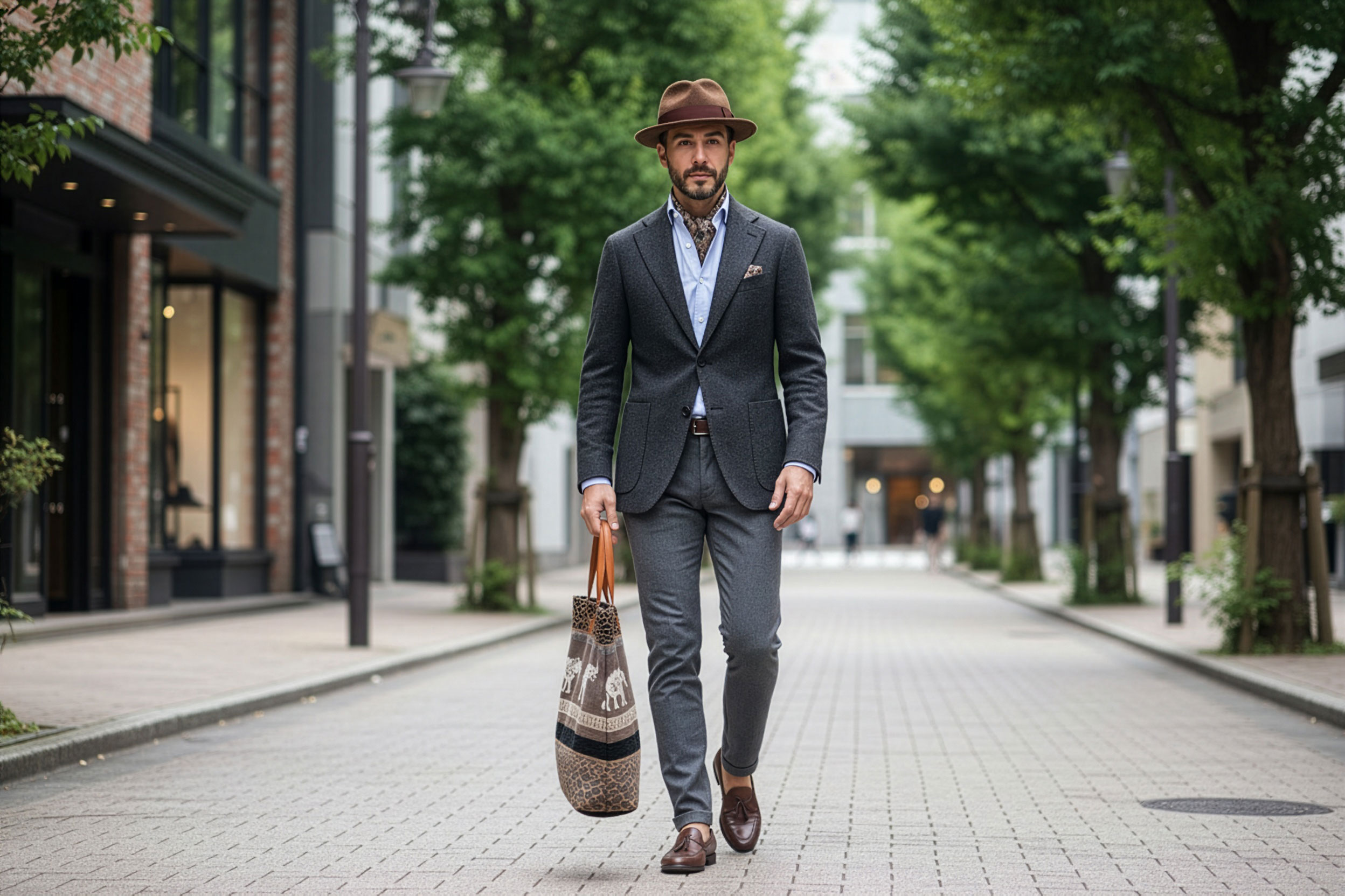 ・洗練された異素材のコントラスト 上部の幾何学的なパターンと、中央の象のモチーフ、そして力強いレザーハンドルの組み合わせ。アニマルモチーフ特有の子供っぽさを排し、大人が持てる「品格のあるエスニック」へと昇華させました。