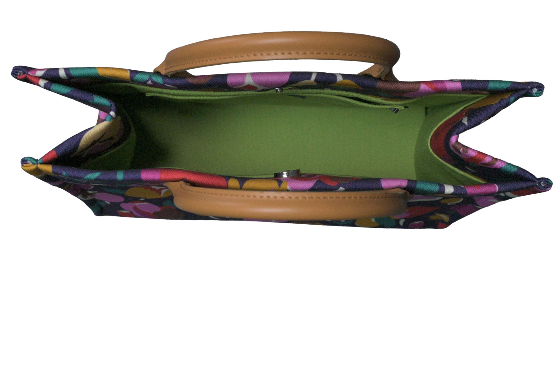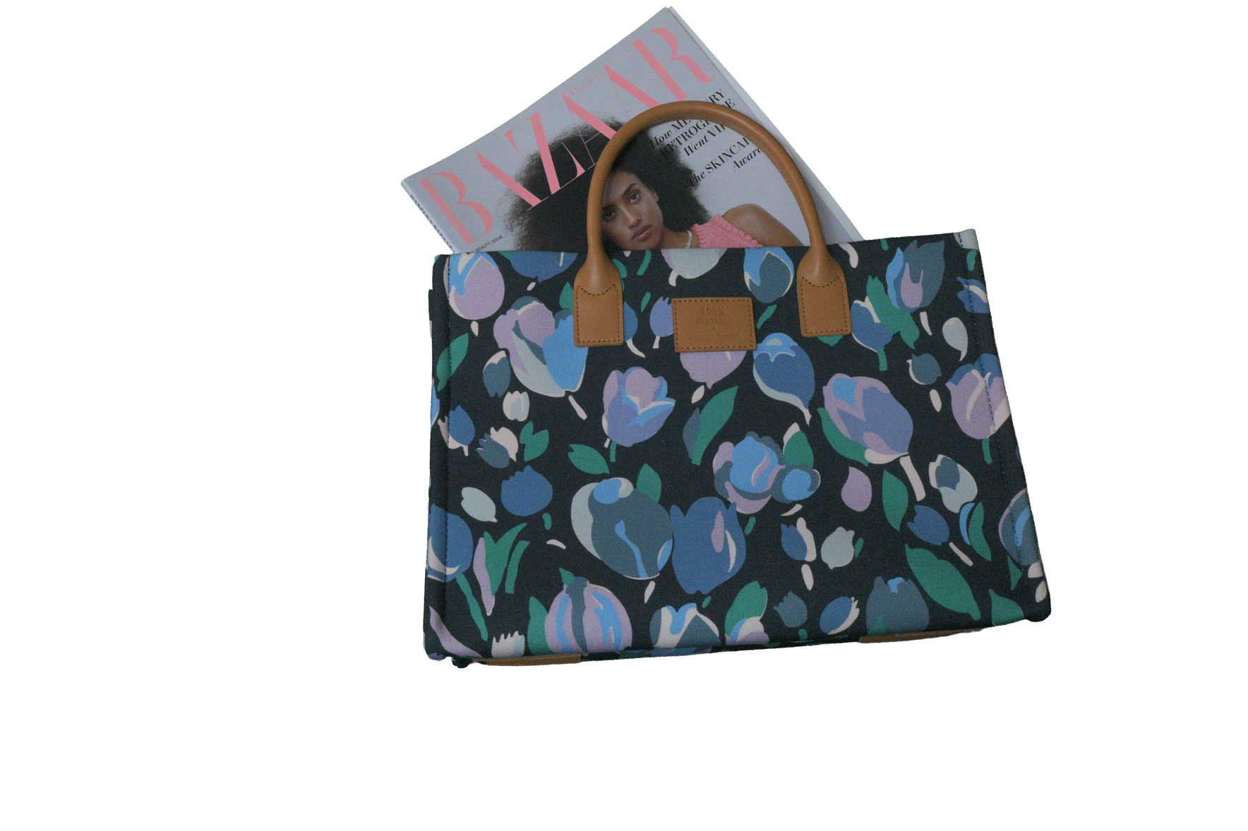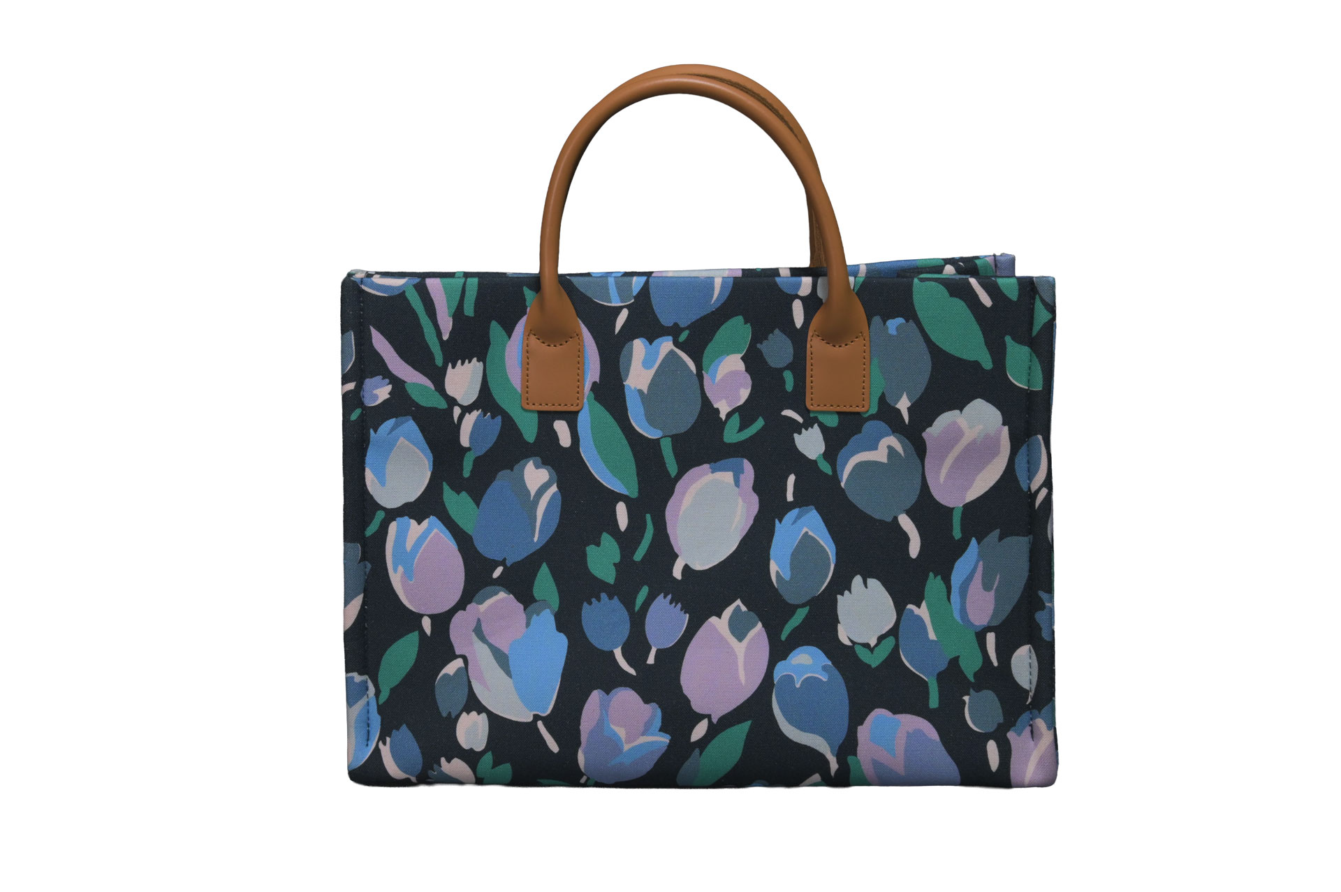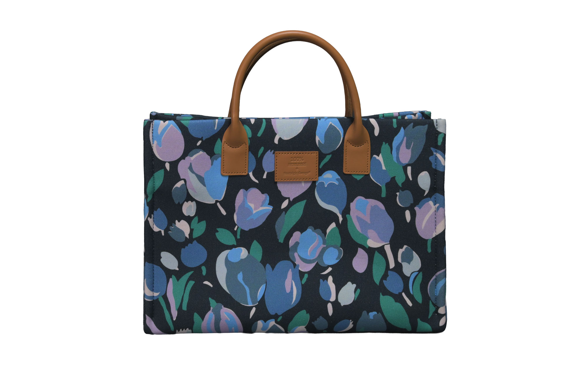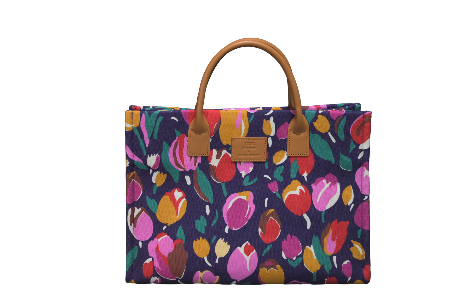 ハンドルにはナチュラルな色味の牛革を合わせ、カラフルなバッグに上品な統一感をプラス。B4サイズまで余裕を持って収まるMEDIUMサイズは、その存在感自体がコーディネートの主役になります。