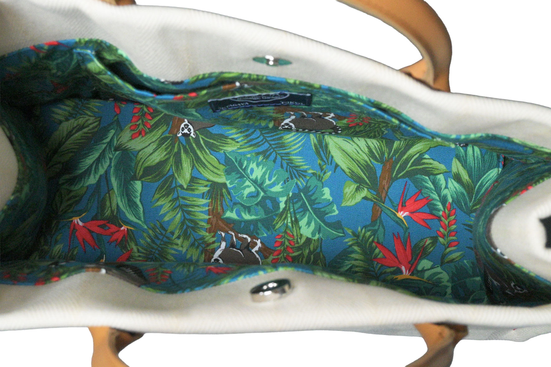 しかし、このバッグの真骨頂は内側にあります。バッグを開けると広がるのは、南国のジャングルを思わせる色鮮やかなボタニカル柄と、愛らしい動物たちの裏地。表のミニマルな印象を裏切る、ノスタルジックガレージらしいサプライズが、持つ人の日常をワクワクさせてくれます。