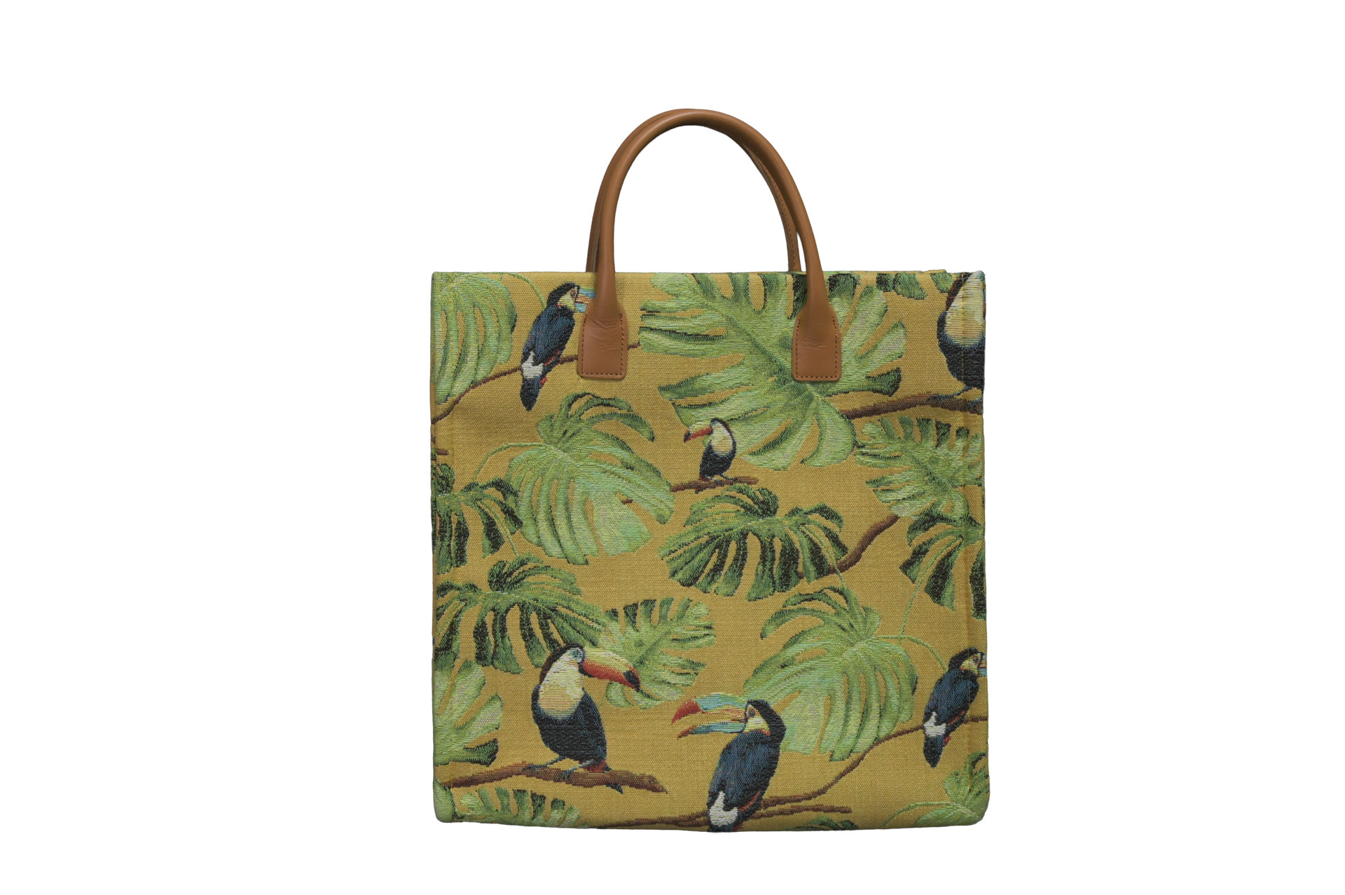 マスタードイエローを基調とした背景に、生き生きとした表情のオニオオハシ(トゥカン)と瑞々しいモンステラの葉が、緻密な多色使いのジャガード織りで表現されています。プリントでは決して出せない、織り組織による凹凸感と光沢が、バッグ全体に圧倒的な高級感と深みを与えています。