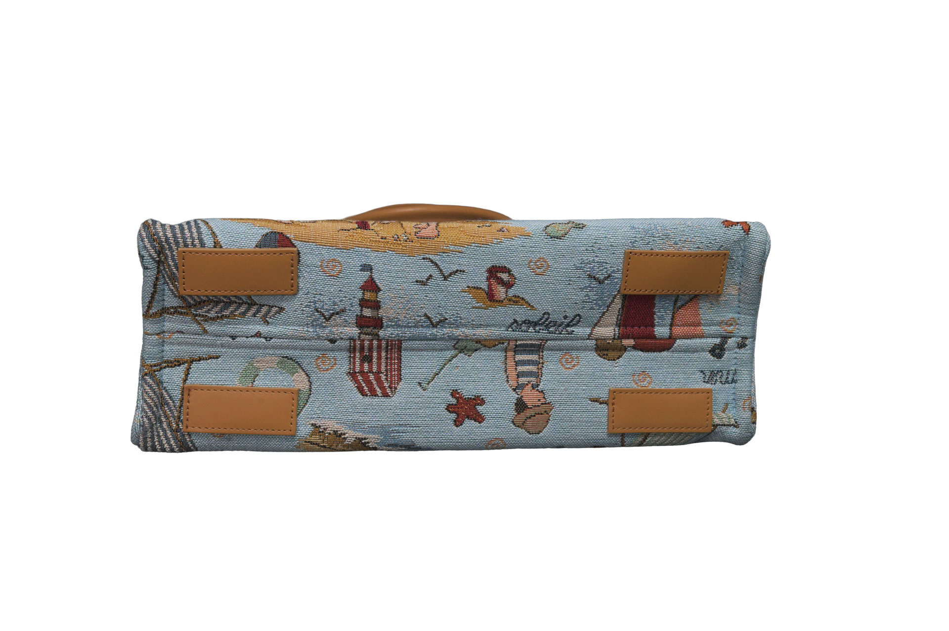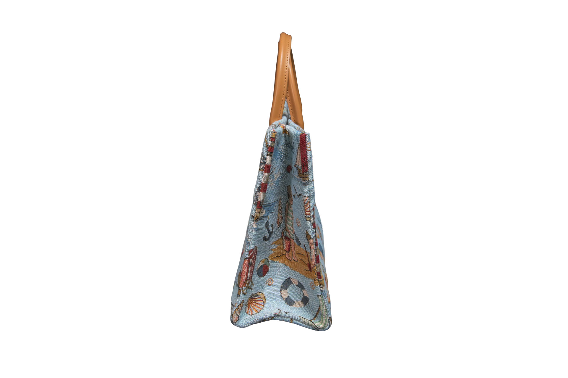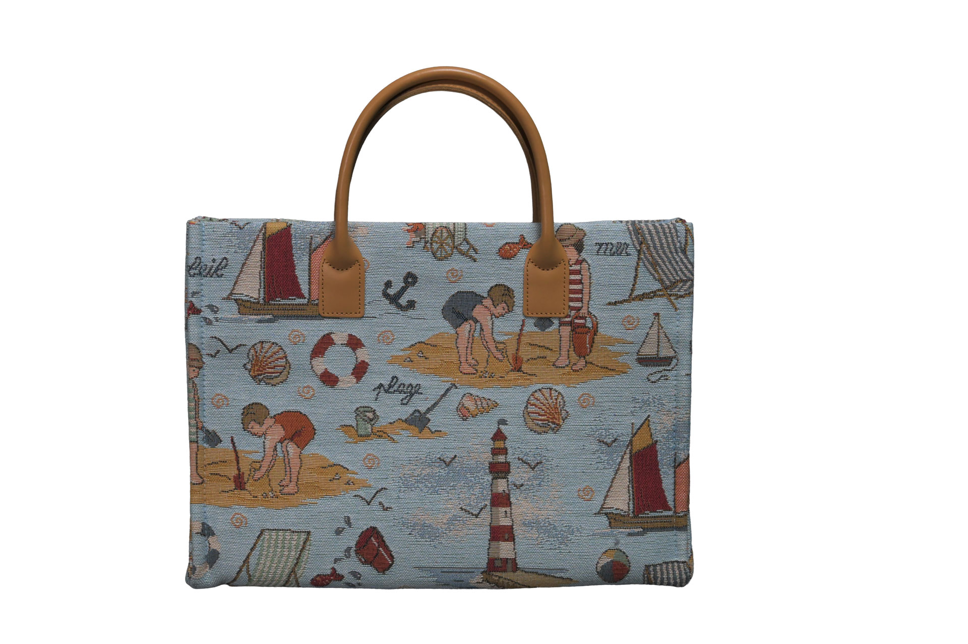 爽やかなライトブルーの背景に、砂遊びに興じる子供たち、ヨット、灯台、そして色とりどりの貝殻。プリントでは表現しきれない、ジャガード織り特有の立体感と繊細な色使いが、どこか懐かしく優しい「夏の記憶」を呼び起こします。