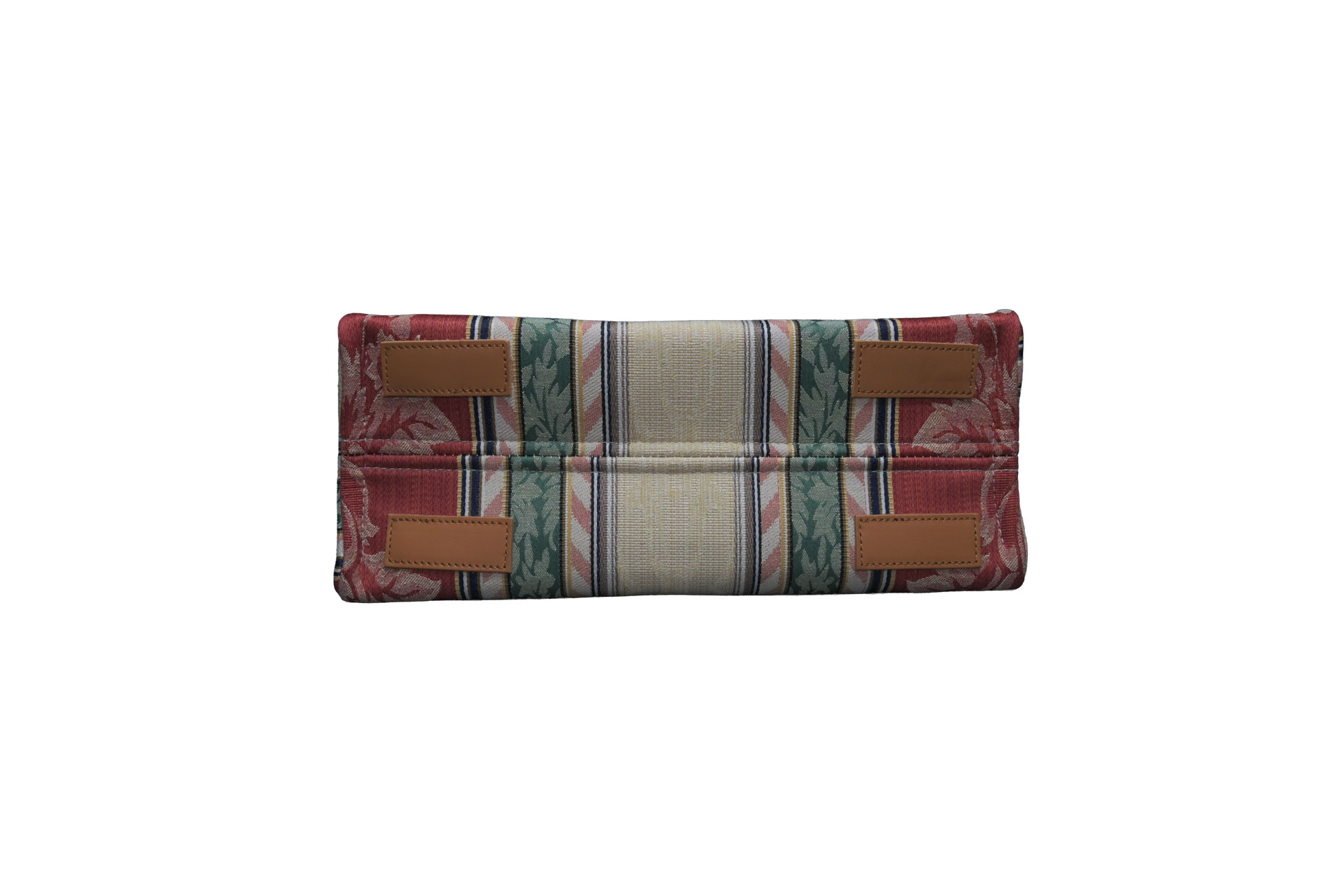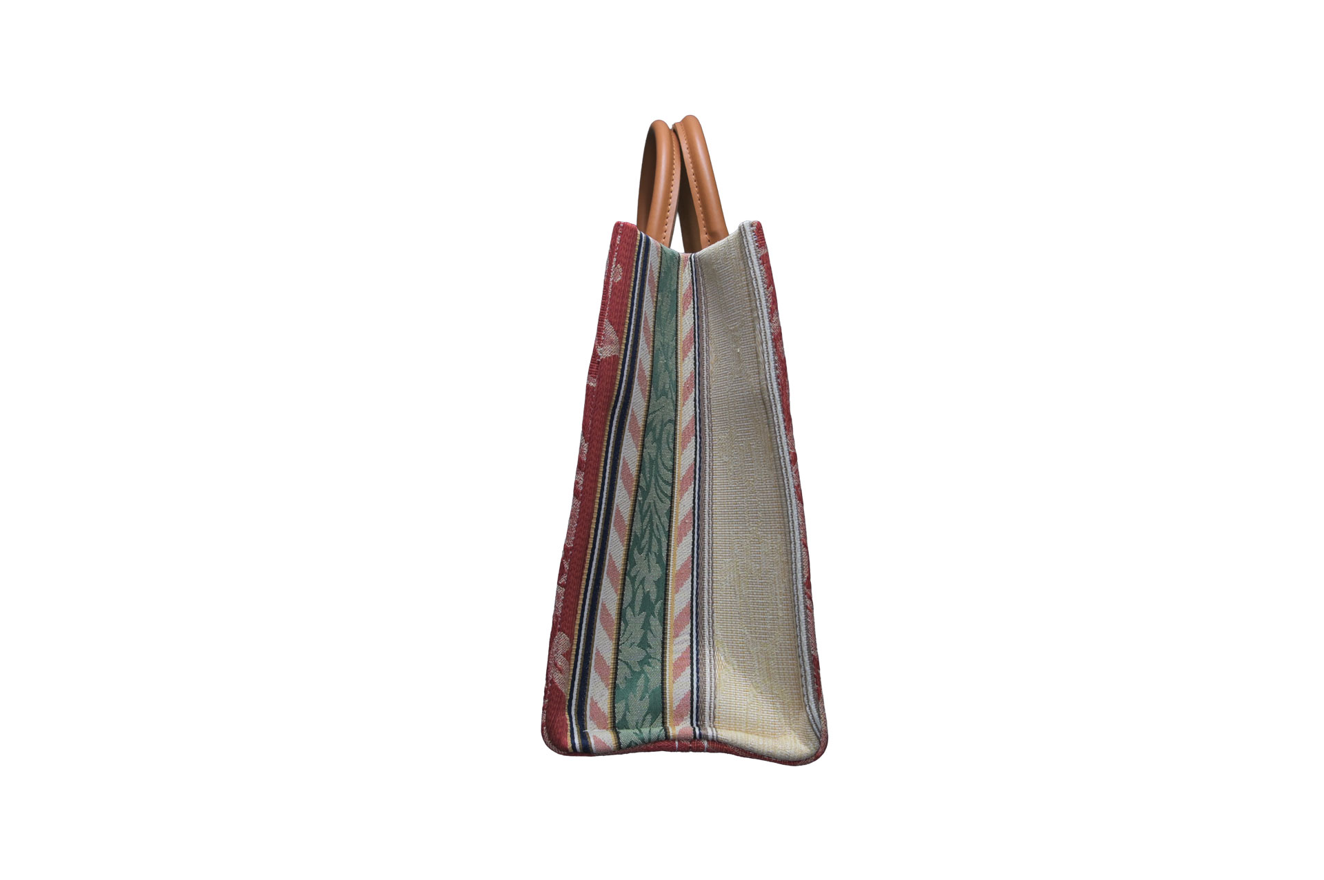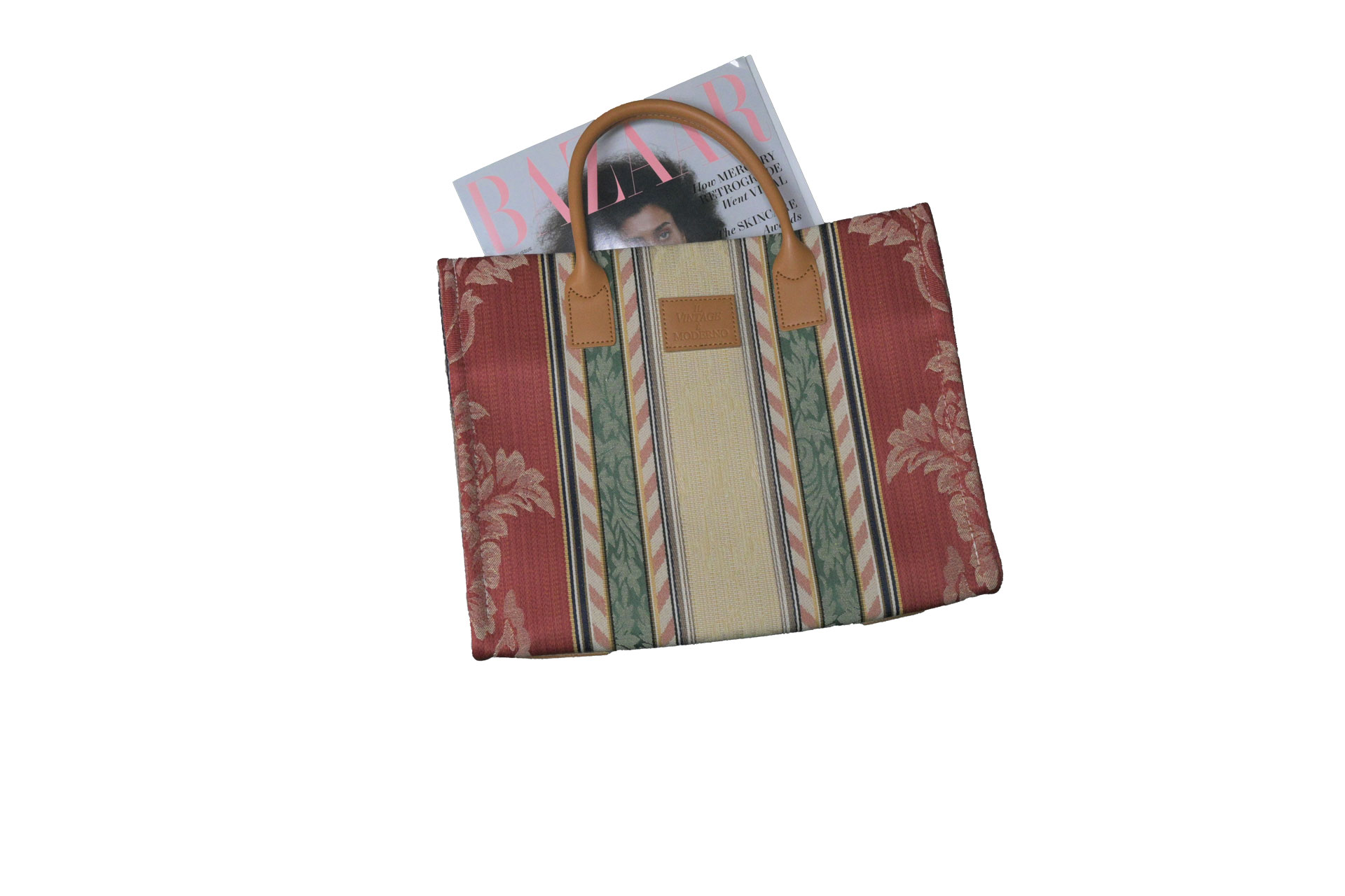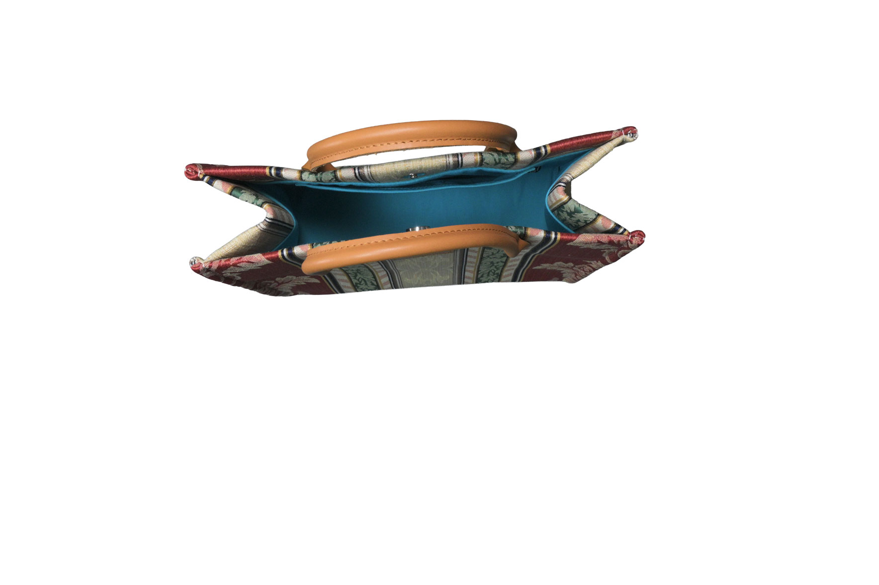 ヴィンテージ特有の落ち着いた発色と、ジャガード織りによる立体的な質感は、現代のプリント生地にはない圧倒的な存在感を放ちます。上質なイタリアンレザーのハンドルと合わせることで、クラシックな気品と現代的な使いやすさを両立させました。