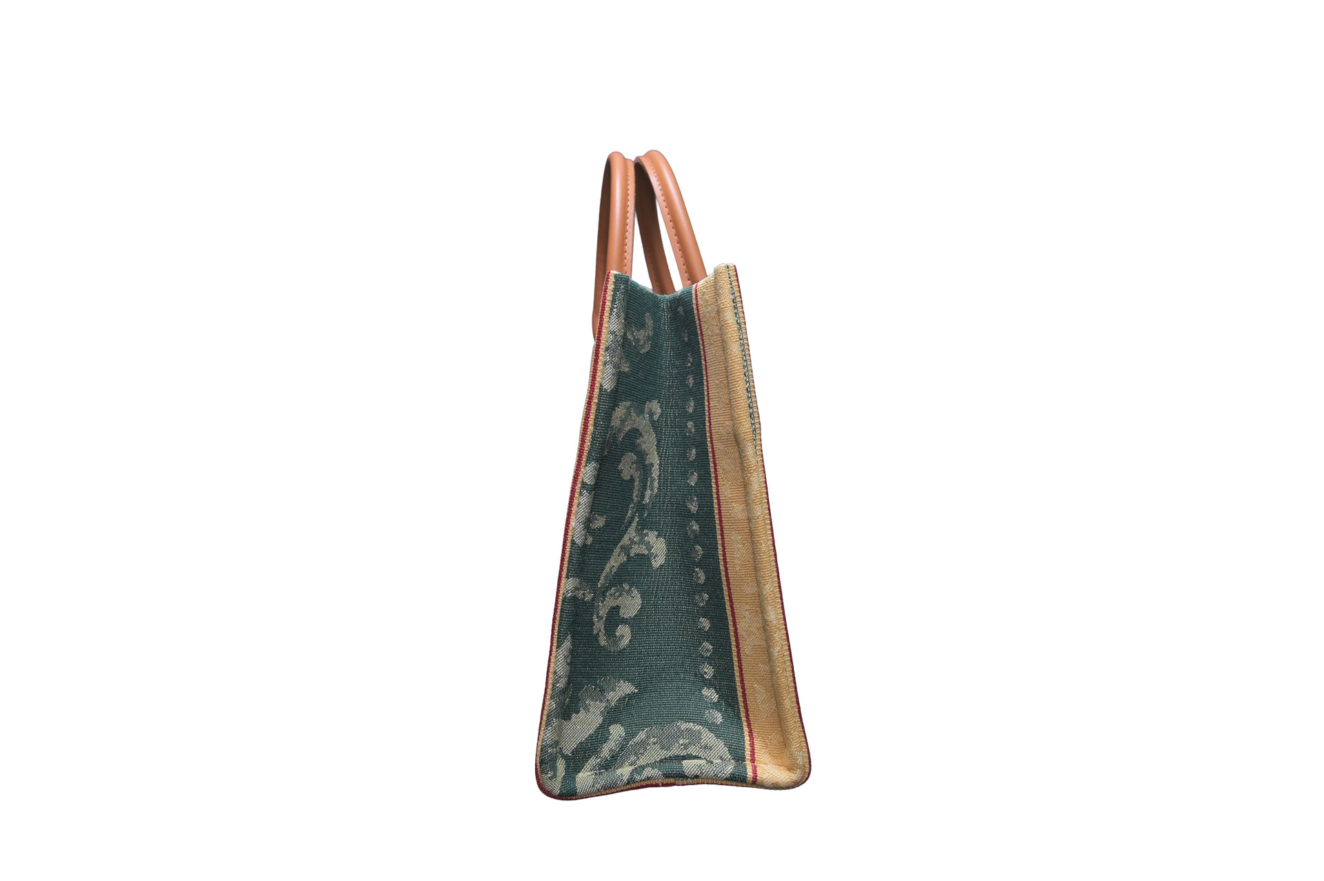 この時代の生地は、伝統的な意匠はそのままに、合成繊維をブレンドすることで耐久性を飛躍的に向上させた「実用的な芸術品」としての側面を持ちます。イタリア各地のコレクターの協力を得て奇跡的に発掘されたこのテキスタイルは、深みのあるROSSO(赤)、高貴なVERDE(緑)、そして随所に光るORO(黄金)が織りなす圧倒的な存在感が魅力です。