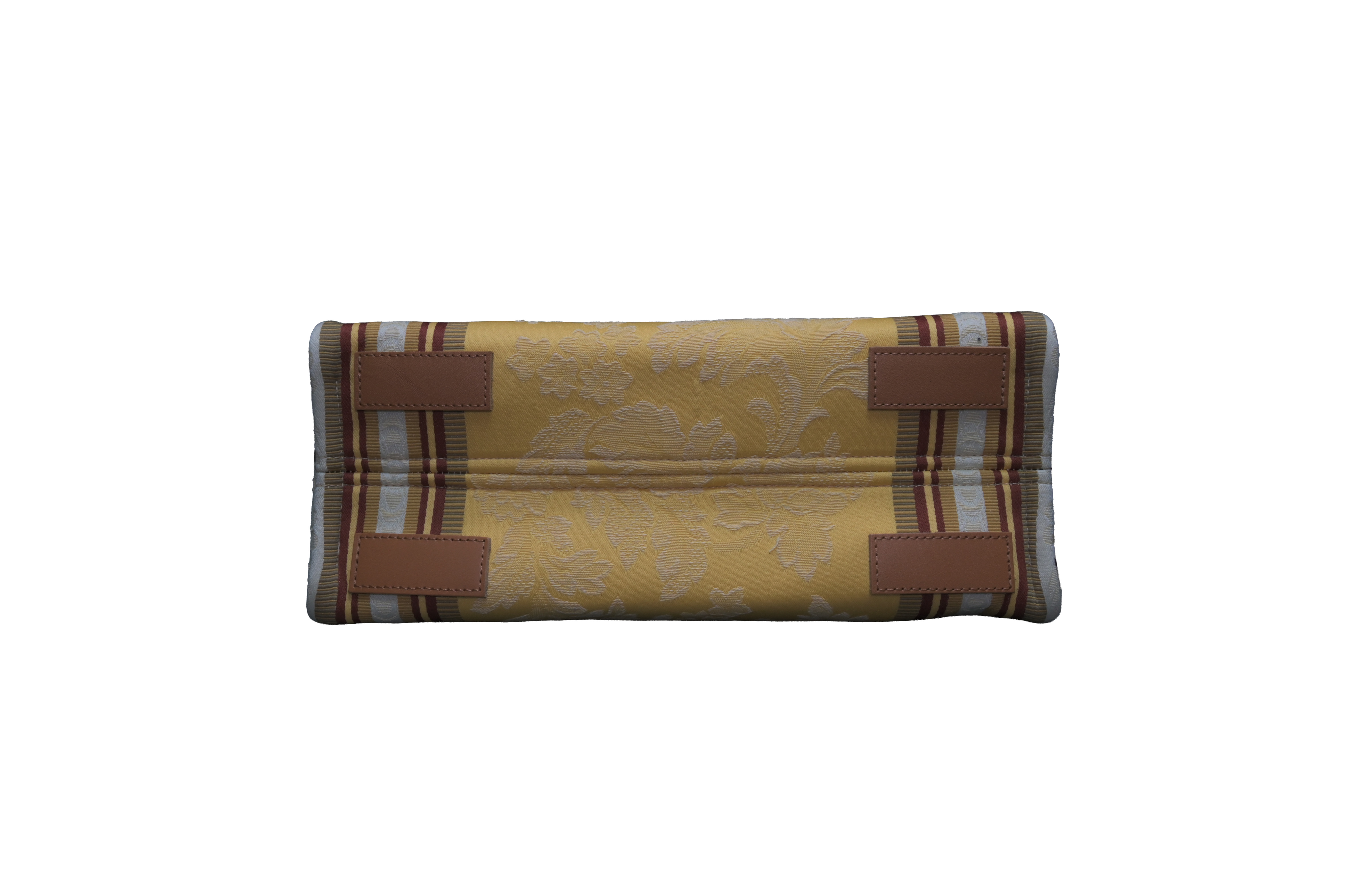 イタリア語で「GIALLO(黄色)」を意味するマスタードイエローの地色に、同系色で織り込まれた大ぶりの花紋様が、光の角度によって贅沢な陰影を描き出します。サイドを走る「MARRONE(ブラウン)」とシルバーのラインが、古典的な紋様に現代的なリズムを加え、全体をシャープな印象に引き締めています。