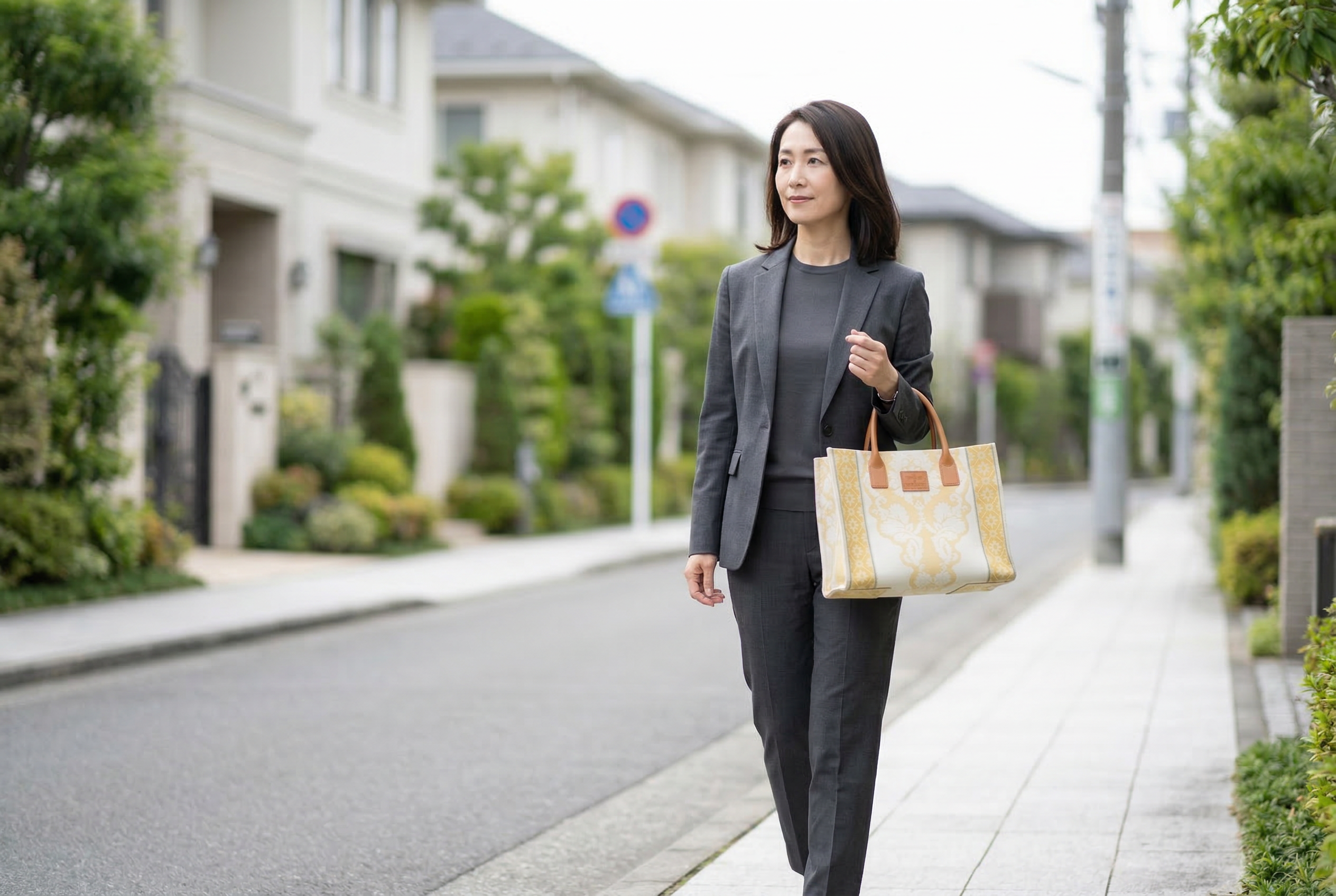 Minimalist Chic: 洋装では、ホワイトやチャコールグレーのシンプルなコーディネートに。バッグの紋様が持つ「工芸品」のような美しさが際立ち、装い全体をアーティスティックな印象へと導きます。