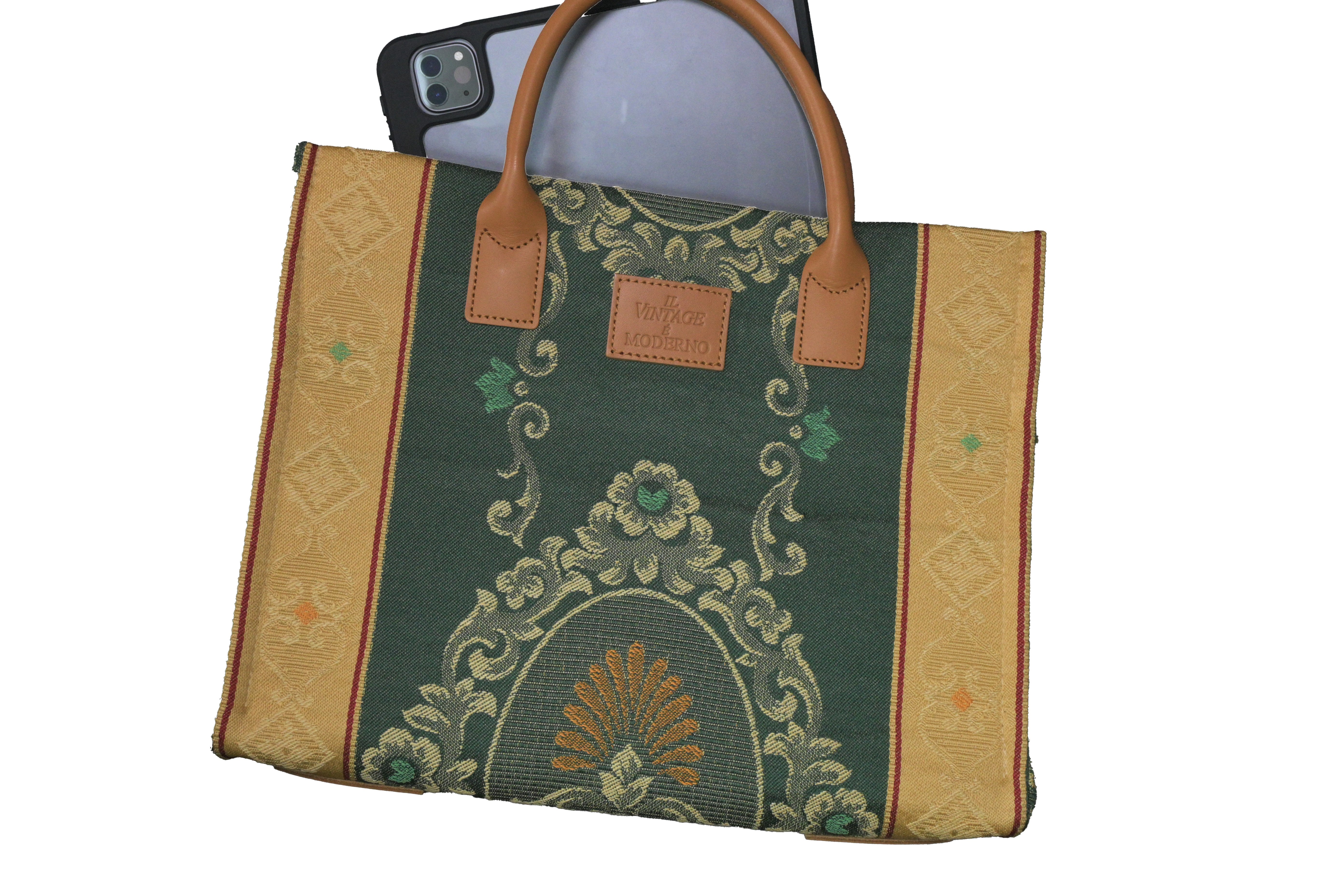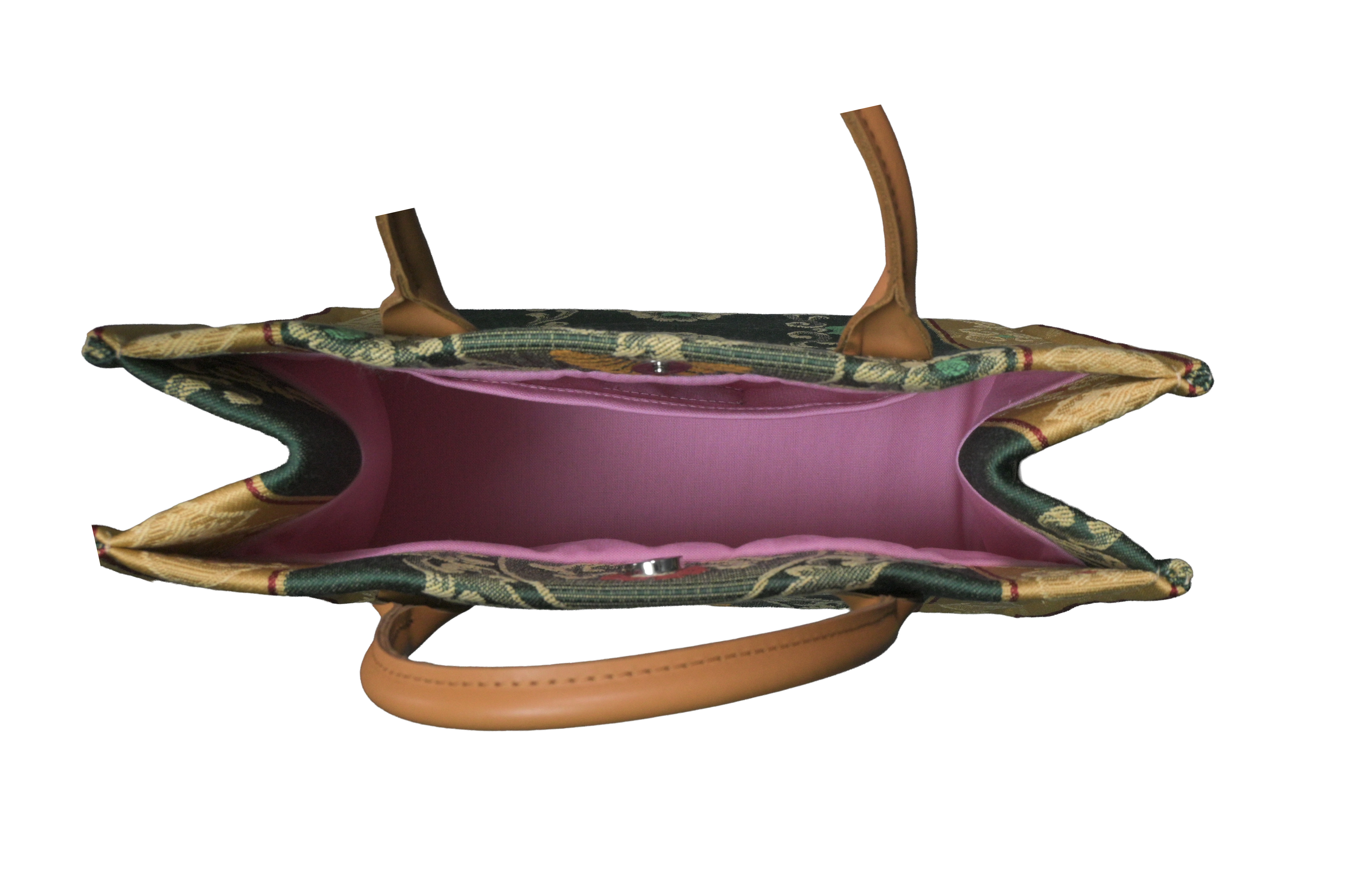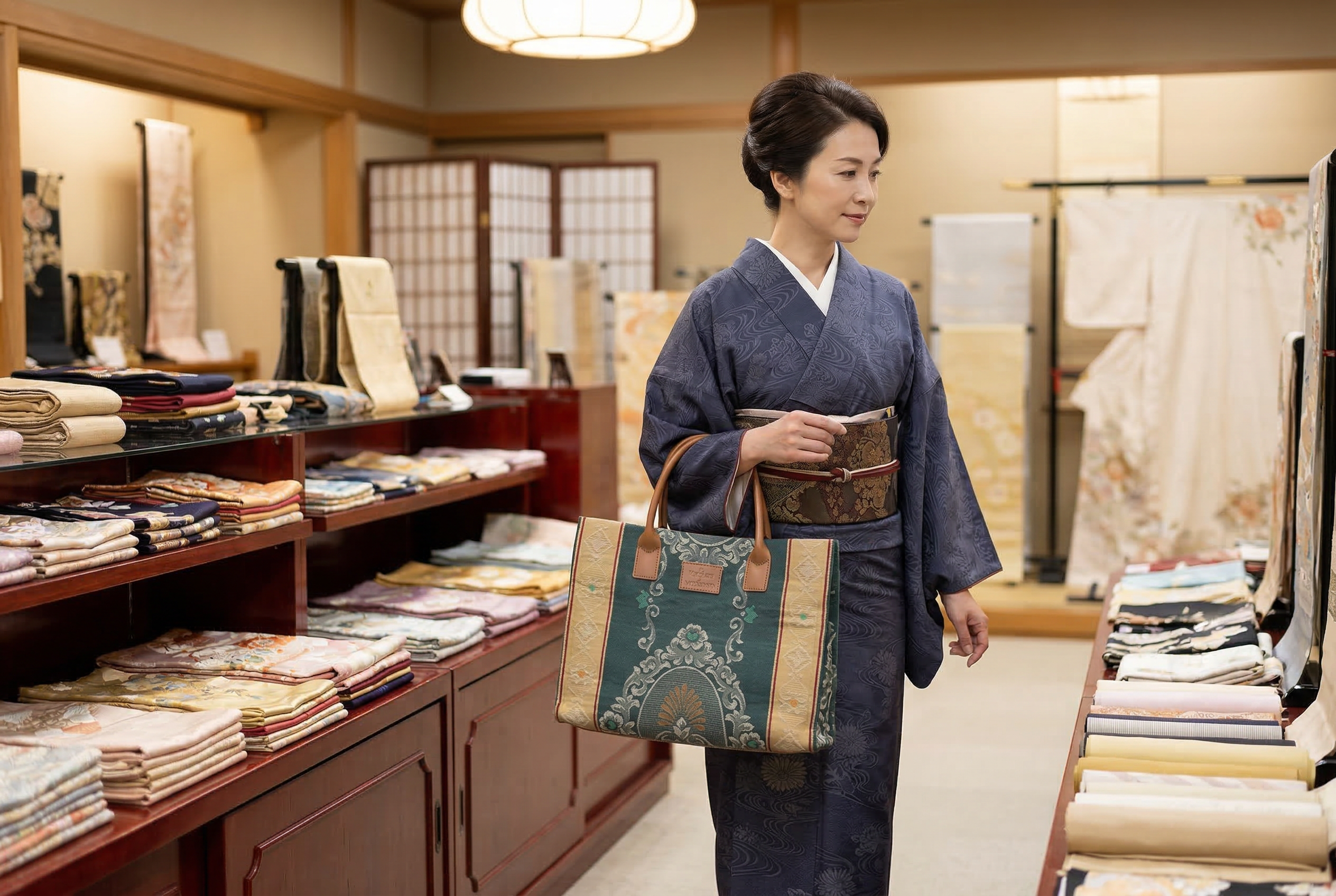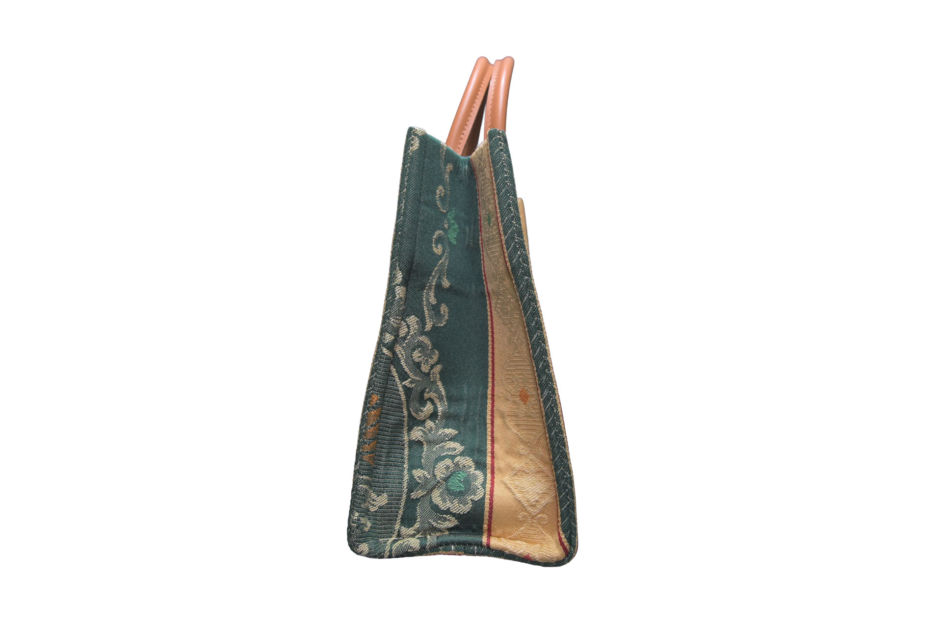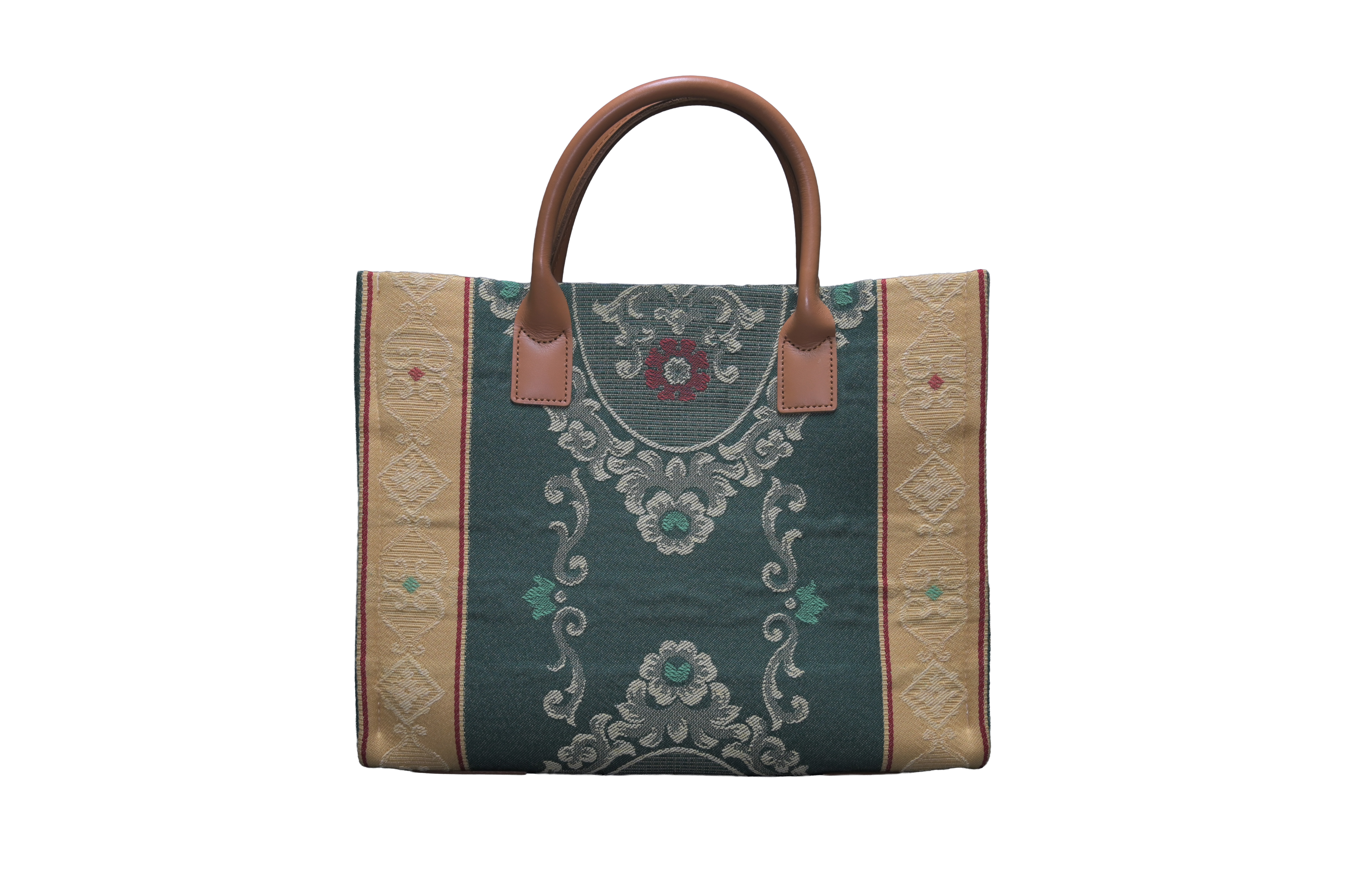 和装・着物スタイル: 特筆すべきは、お着物との深い親和性です。 中央の王冠のような紋様と深い緑の配色は、まるで格調高い帯を合わせたかのような重厚感を演出します。落ち着いた色味の訪問着や、キリリとした結城紬など、大人の女性が嗜む和の装いに見事に調和。初詣やお茶会、観劇など、フォーマルなエッセンスを添えたい日の和装バッグとして最適です。