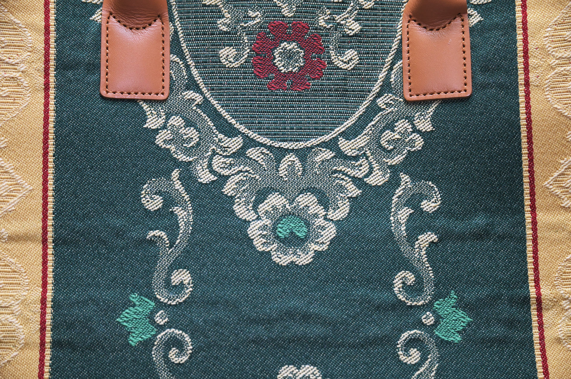 本モデル「VERDE/ORO CROWN」は、落ち着きのある深いグリーン(VERDE)を背景に、ゴールド(ORO)の紋様を王冠のように中央に配した格調高いデザイン。1950年代以降に開発された混紡技術により、織り組織の密度が高まり、当時のイタリアらしい力強くも繊細な多色使いが実現されています。