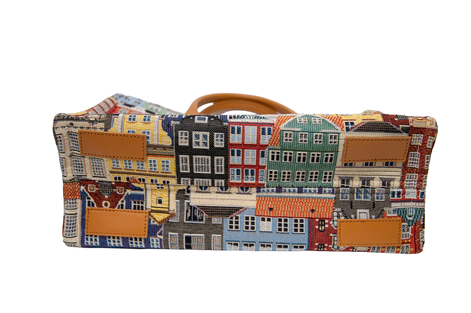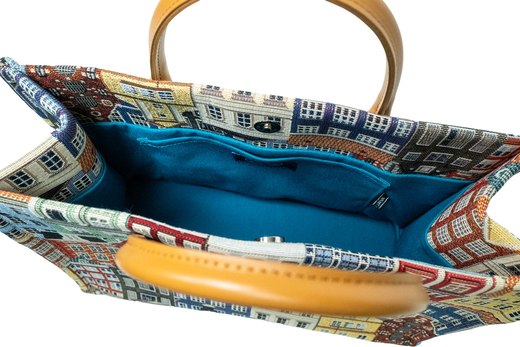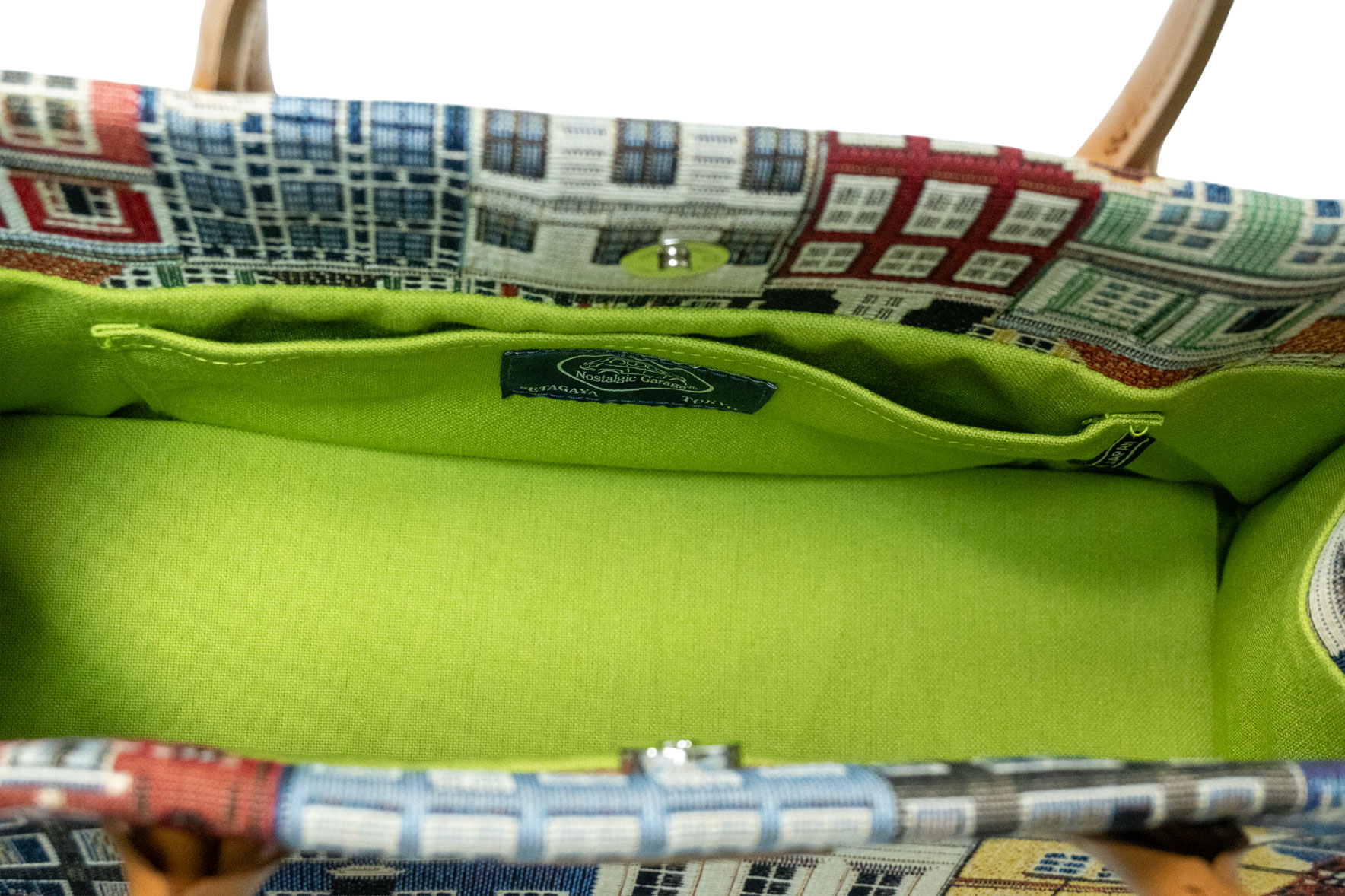 ハッとする裏地の色使い: バッグを開くと現れるのは、鮮やかなライムグリーンやスカイブルー。外側のクラシックな街並みとのギャップが楽しく、荷物を取り出すたびに気分が上がります。中が明るいことで、小物が探し出しやすいという実用的なメリットも。